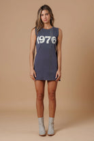 Turn back time in style with the 1976 Tank Dress. This sleeveless mini blends vintage-inspired cool with modern edge, featuring distressed “1976” lettering across the chest and vertical rhinestone detailing that adds just the right touch of sparkle. Cut from 100% breathable cotton in a vintage black wash, it’s a versatile piece that moves effortlessly from summer days to fall nights.