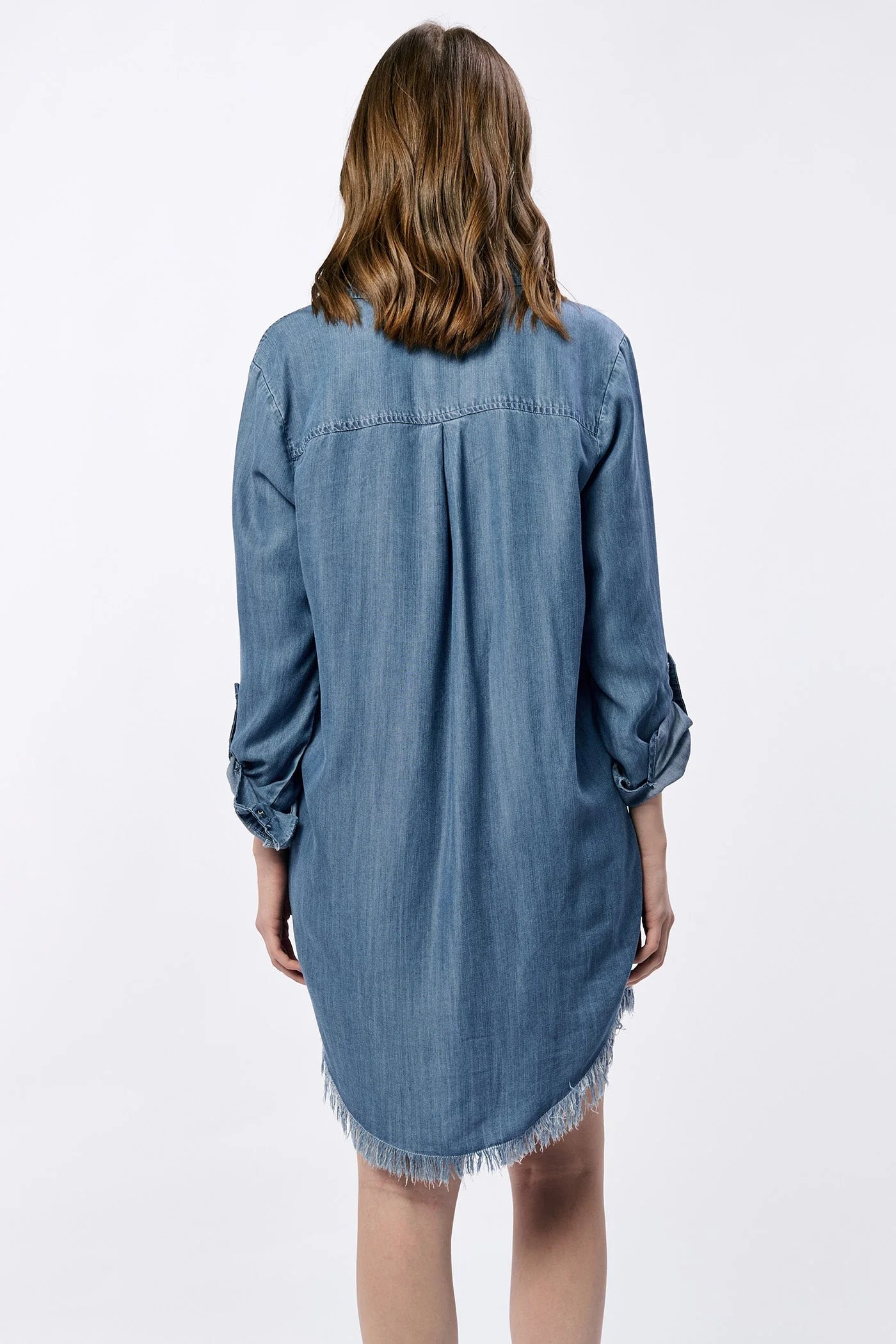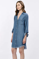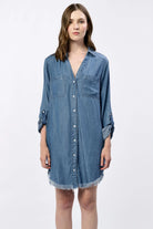 The dress features a classic collared button-up design and long sleeves, offering a polished look suitable for any occasion.