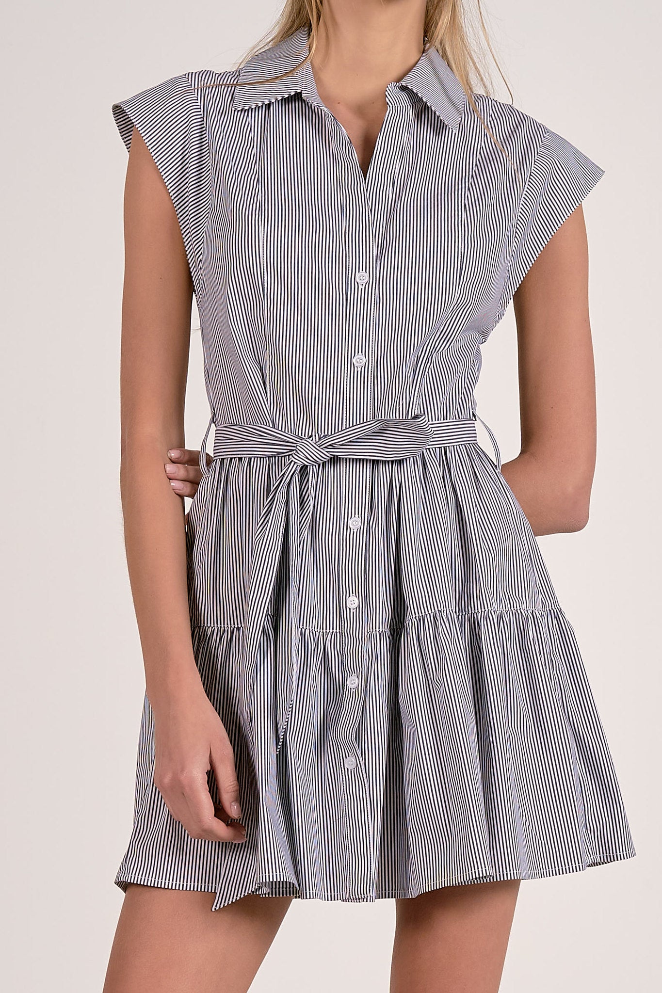 Elevate your everyday style with the Bianca Dress, a chic tiered mini that blends timeless elegance with playful modern details. Crafted in a breathable cotton-blend fabric with just the right amount of stretch, this dress ensures comfort without compromising on style. The classic collared neckline, button-up front, and adjustable tie waist create a flattering silhouette, while the tiered skirt and subtle ruffle accents bring a feminine, flirty touch. Cap sleeves and a refined striped print complete the look with effortless sophistication.