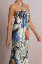 Romantic, flowy, and effortlessly eye-catching, the Calista Halter Maxi Dress is made for warm-weather moments that call for a little extra style. Featuring a vibrant blue botanical print, this floor-length silhouette showcases a halter neckline with a chic O-ring detail and an elegant low open back for a touch of modern allure. The lightweight fabric drapes beautifully, while the adjustable tie at the neck ensures a comfortable, customizable fit. Easy to slip on and instantly elevated, this maxi is perfect for vacations, events, or sun-soaked days that turn into evening plans.