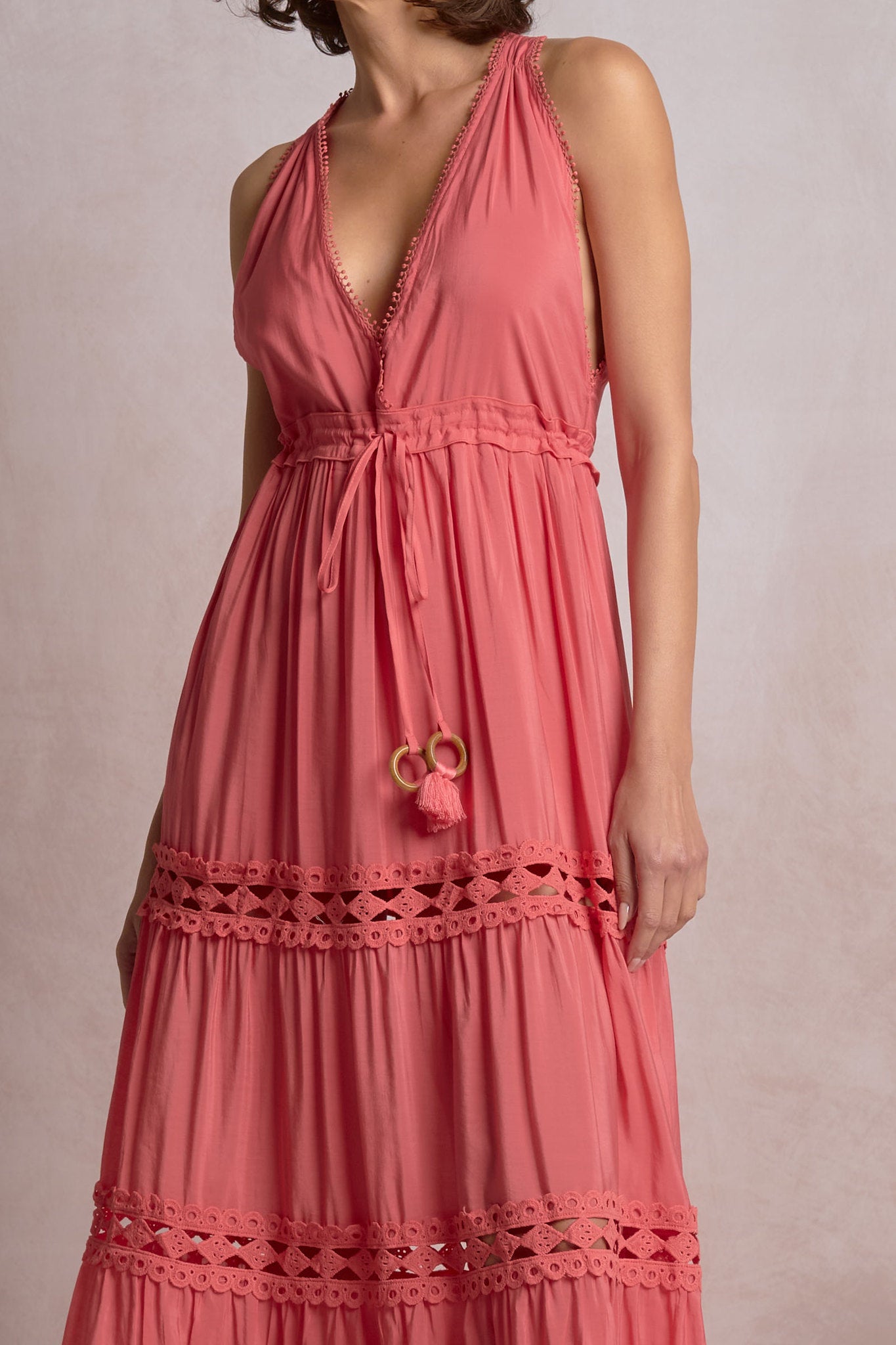 The Callie Halter Maxi Dress is a flowing ankle‑length sundress with a deep V halter neckline and a cinched drawstring waist. Elan gives it tiered panels and openwork trim that create a relaxed, bohemian silhouette. Lightweight woven fabric and sleeveless styling make it perfect for warm‑weather wear or resort getaways. Pair it with sandals for a casual daytime look or dress it up with simple jewelry.