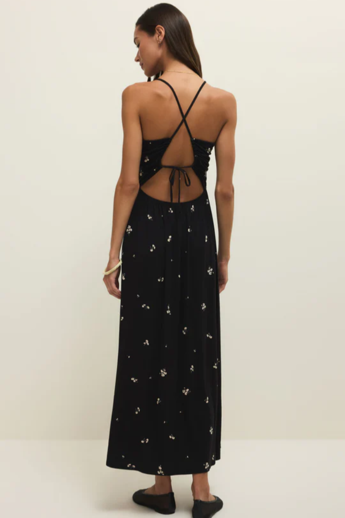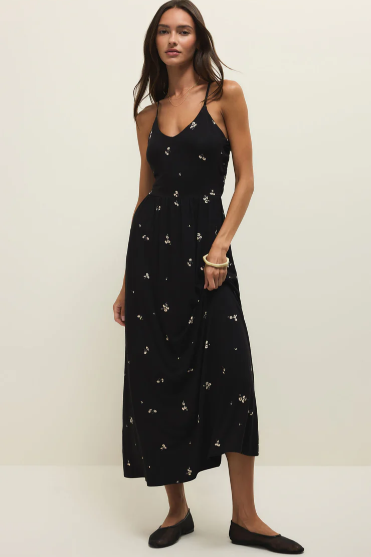 Effortless style meets everyday comfort in the Cannes Nala Ditsy Midi Dress in Black from Z Supply. Crafted from soft, breathable cotton knit, this midi moves with you from morning errands to weekend plans without missing a beat. The adjustable tie-front detail allows you to tailor the fit and neckline to your liking, adding a touch of charm and versatility. Finished with a flattering midi length, it’s the kind of easy essential that dresses up beautifully with heels and accessories or stays perfectly casual with sneakers and slides. A timeless black staple you’ll reach for again and again.