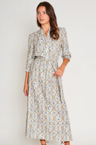 The Cassie Dress features a button-up bodice, 3/4 cuffed sleeves, and a graceful tea-length hemline—an effortlessly chic silhouette that embodies summer ease and timeless elegance. Designed in the Santorini Mosaic print, it showcases a captivating blend of blue, cream, and orange patterns on a soft ivory base. Finished with chest pockets and a belted waist, it’s the perfect balance of refined and relaxed.