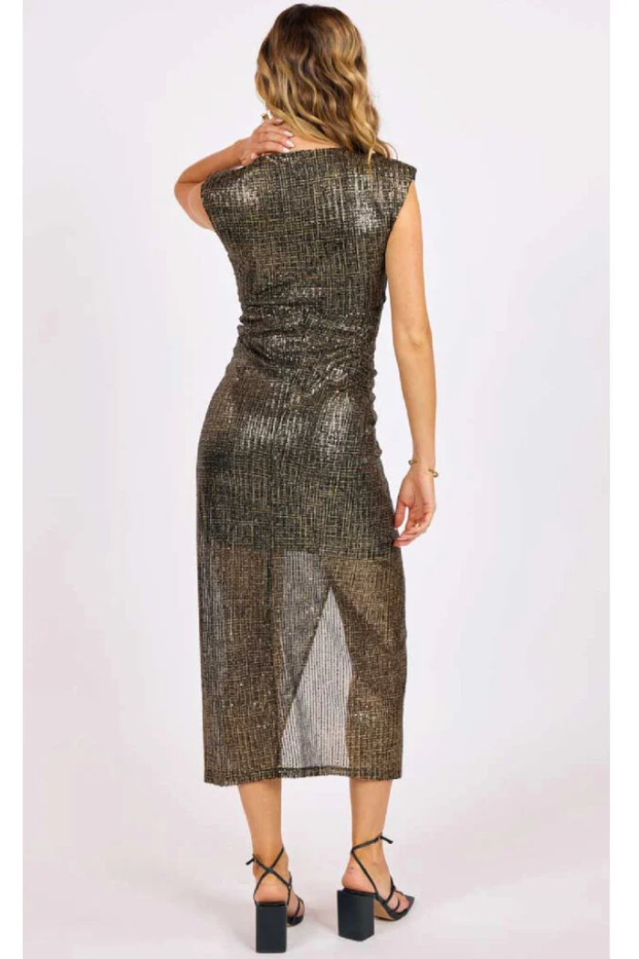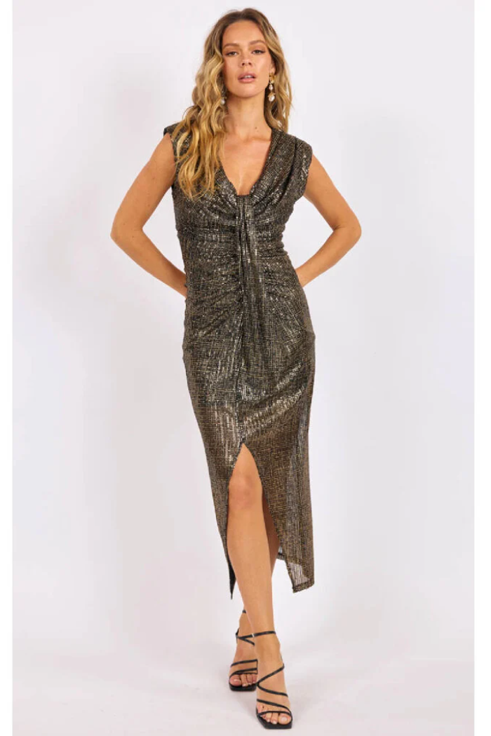 Thoughtful ruching along the front shapes and flatters the figure, while the refined V-neckline and sleeveless silhouette create a clean, modern finish. A subtle center slit adds just the right touch of movement and intrigue.