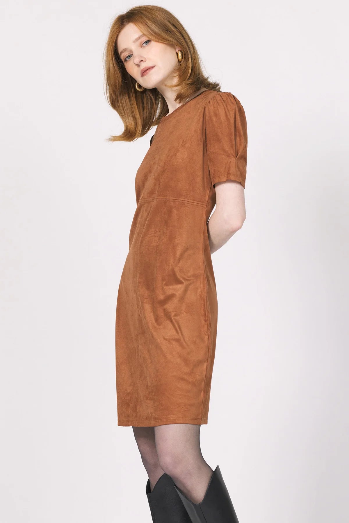 The DEMI short sleeve mini dress with a seaming detail finish. Dress up or wear casual. Solid color suede woven on standard fit.