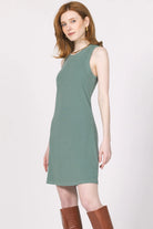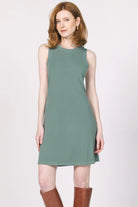 The Justin rib dress offers a sleek crew neck, sleeveless design with a comfortable, flattering classic fit. Perfect on its own or layered, it adds effortless elegance to any outfit.