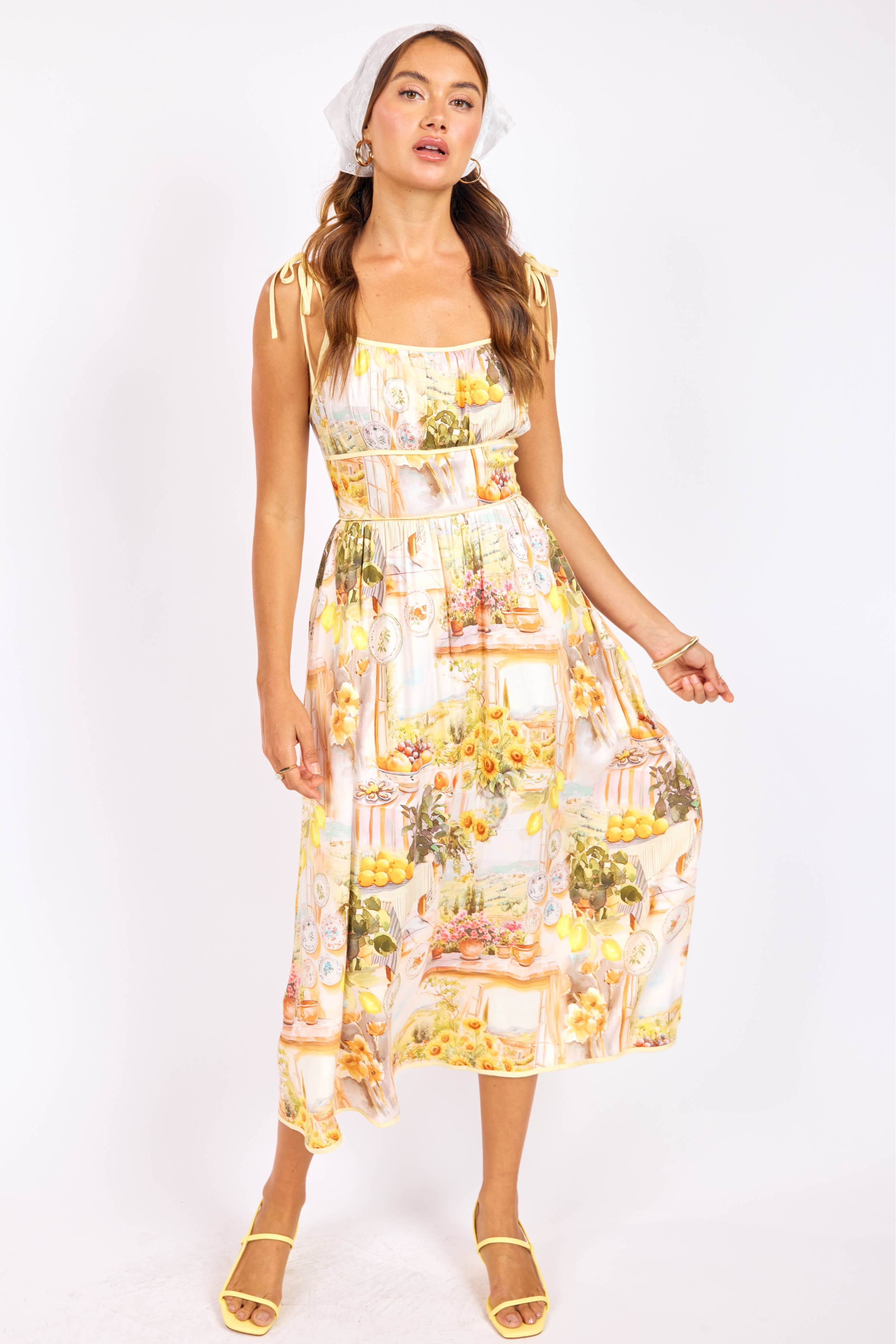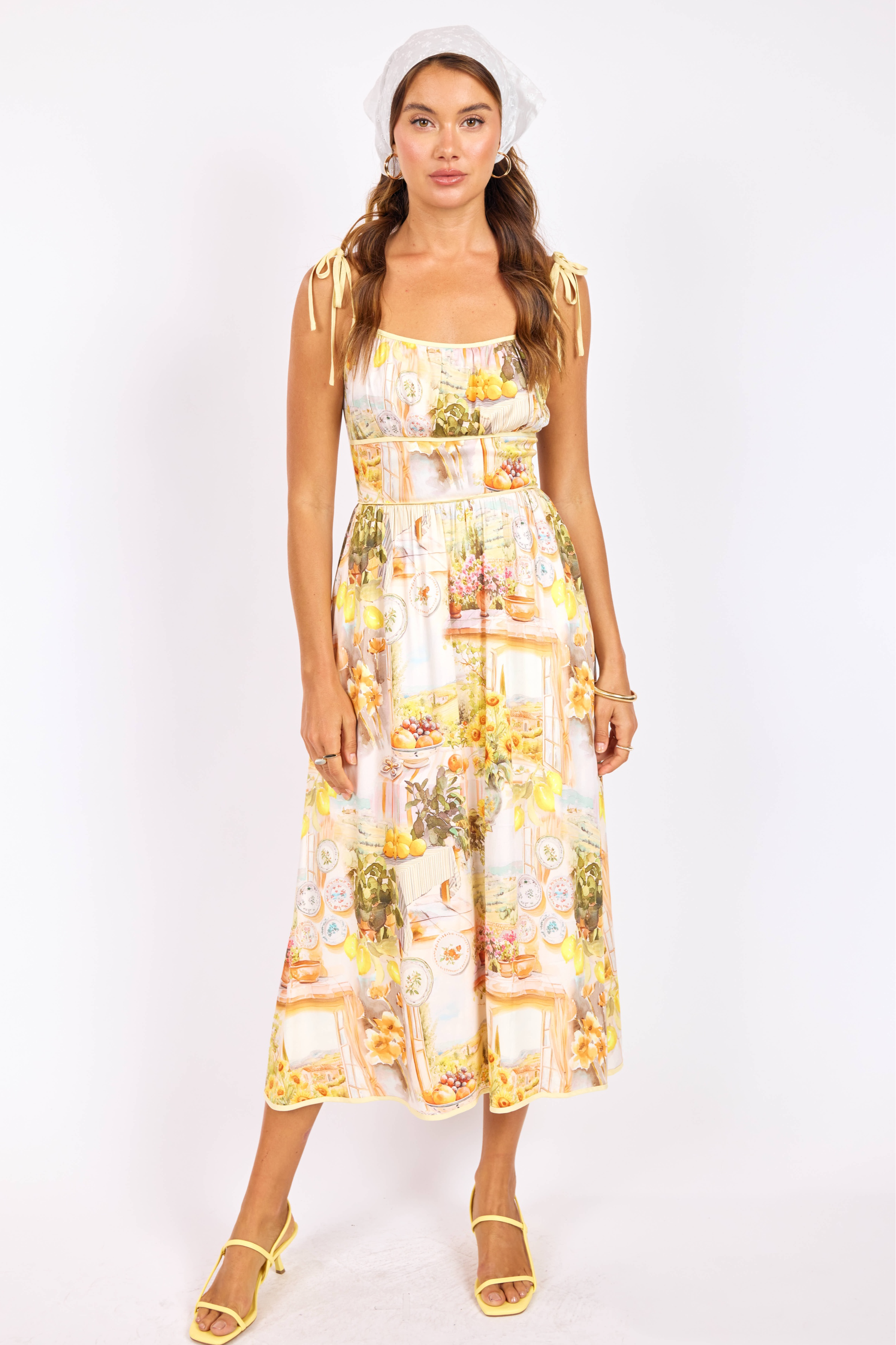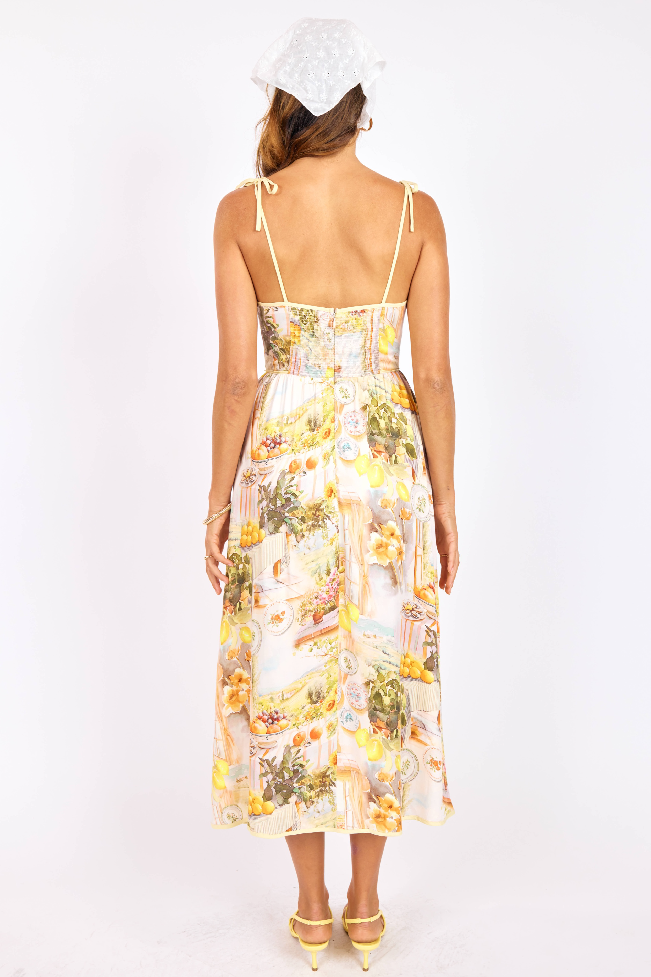 A breezy, printed midi with adjustable tie-shoulder straps and a fitted waist that floats into a full skirt. The Limoncello Midi Dress channels sunny, romantic style with a hand-painted lemon and floral print perfect for warm-weather plans. Crafted and styled by SAGE THE LABEL, it dresses up easily for garden parties or down for vacation days with sandals.
