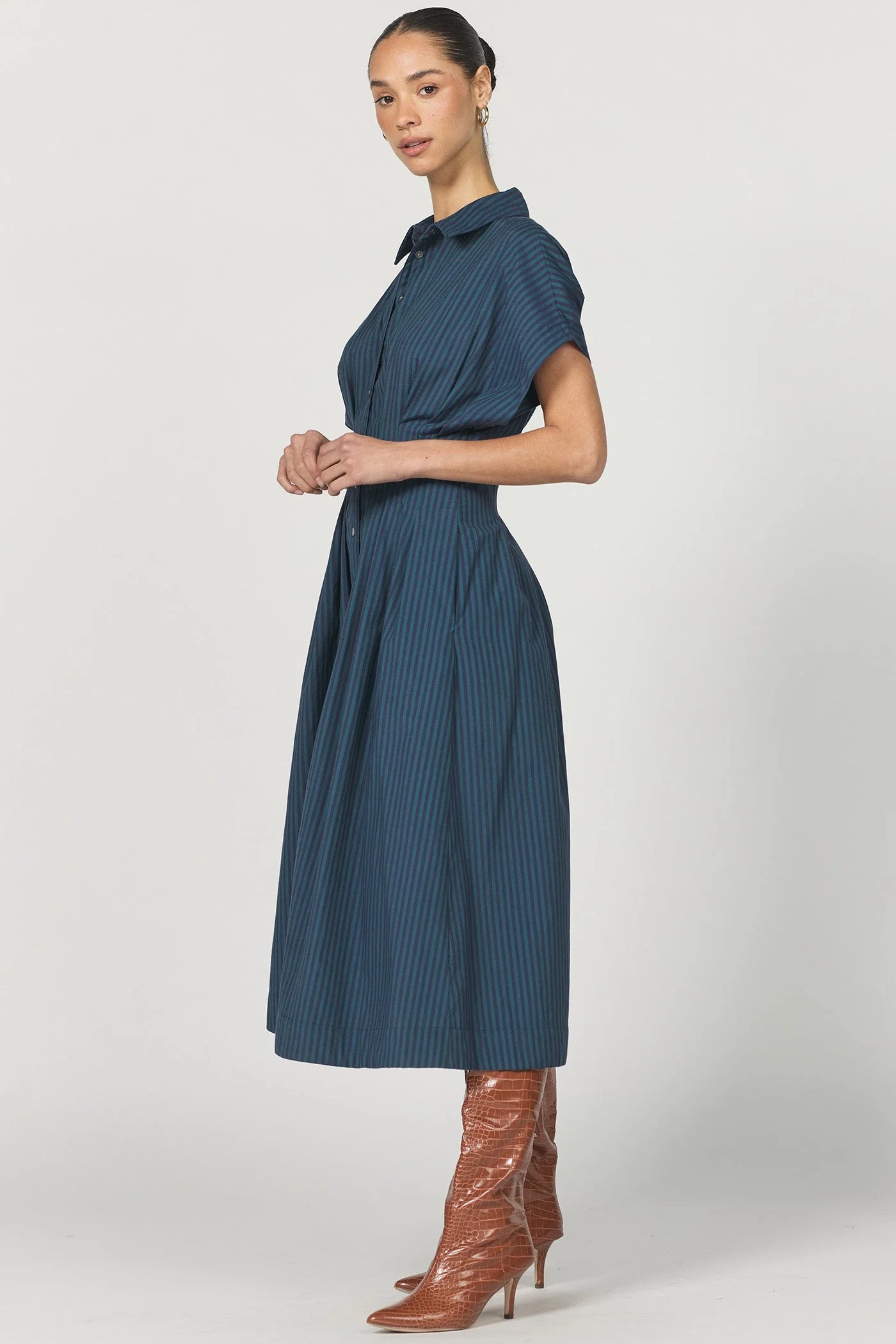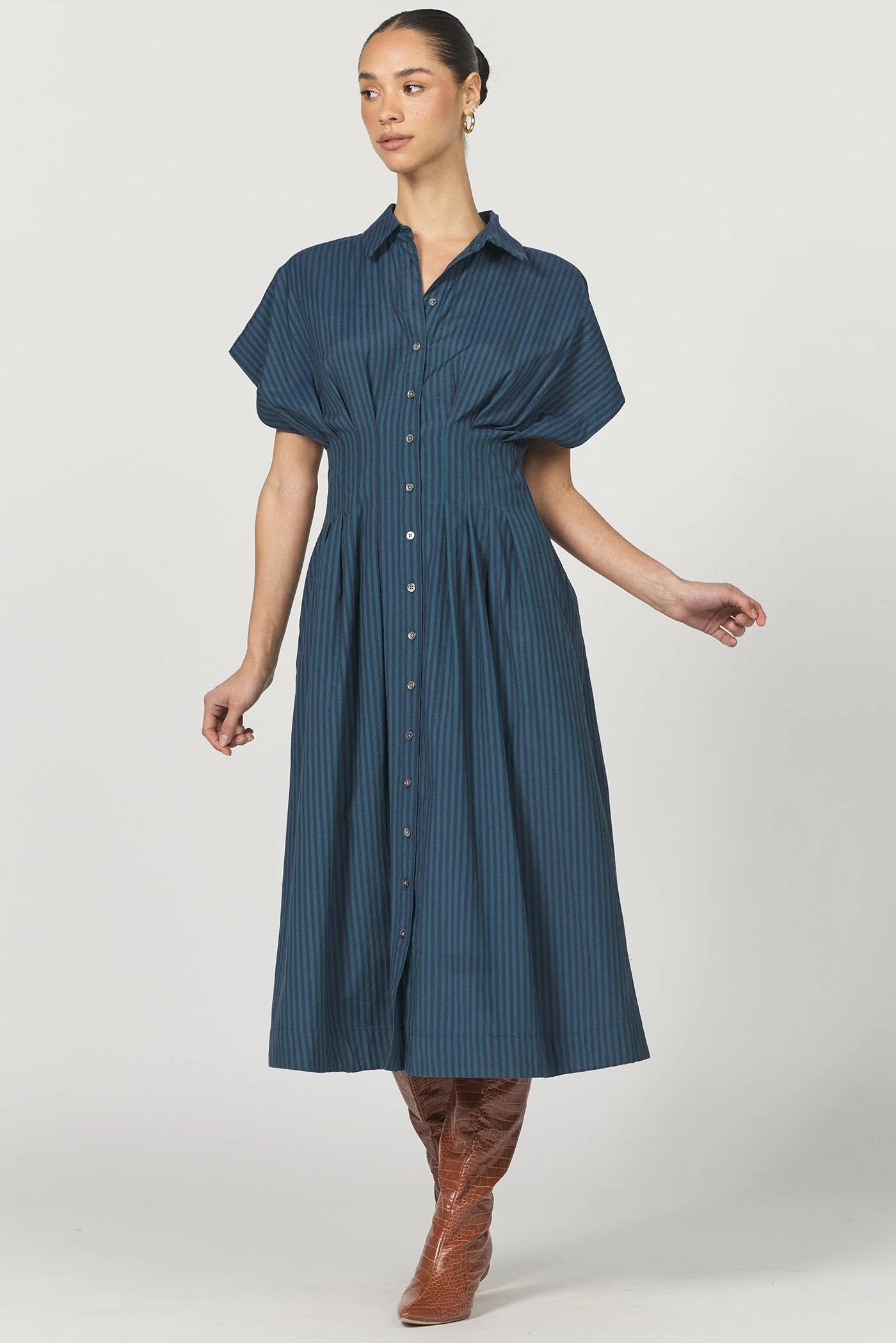 Plisse short sleeve button-up midi dress with a timeless collar design.