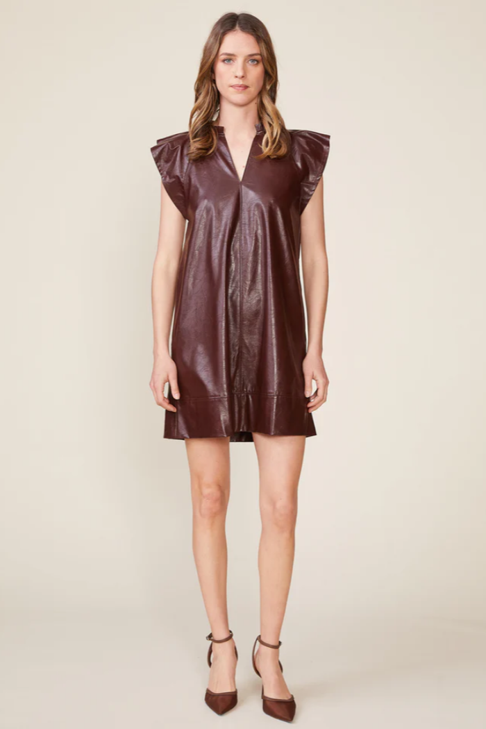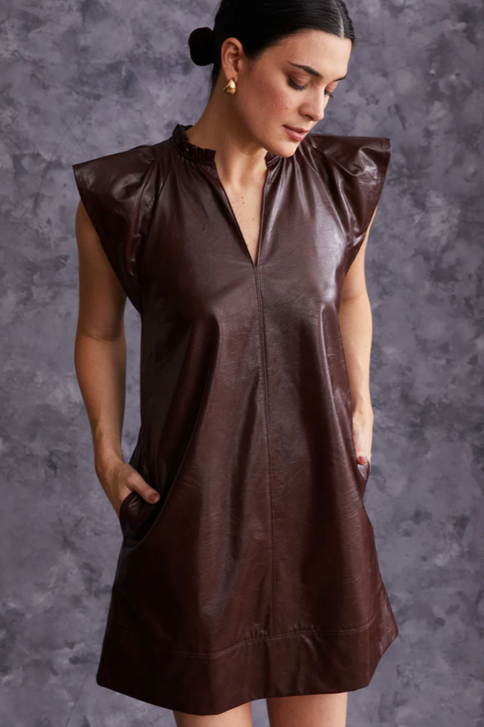This easy, open shape dress in crinkle faux leather has just the right amount of detail. Multi stitch seam work, flutter sleeves, a wide hem band, open neckline and of course pockets make this no fuss dress an effortless go to.