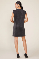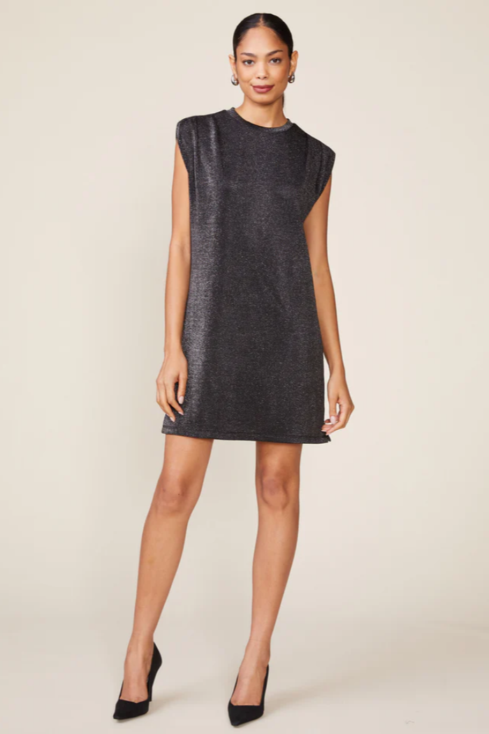 Chic and stunning, this one and done glitter knit dress with pleated muscle cut sleeves is simply irresistible. This easy shift is a standout for all of your holiday events. The fabric is a mid-weight metallic knit with stretch.