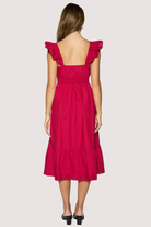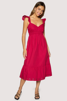 The Vino Kiss Midi Dress exudes romantic sophistication with its graceful sweetheart neckline and cascading ruffled sleeves that frame the shoulders with timeless allure. This elegant piece strikes the perfect balance between feminine charm and polished refinement, making it an ideal choice for elevated occasions or when you simply want to feel extraordinary. The midi length provides versatility and movement, while the delicate ruffle details add dimension without sacrificing grace. Invest in a dress that celebrates your elegance and turns heads with understated glamour.