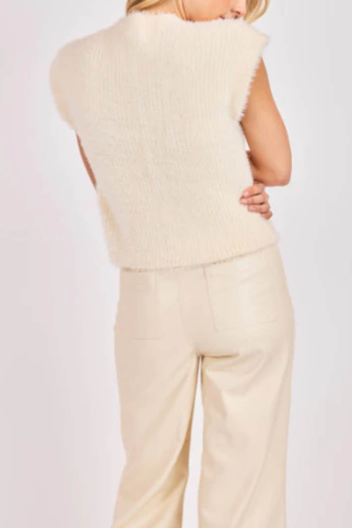 The Bianca Feather Yarn Sweater Tank from Sadie & Sage elevates everyday dressing with its luxuriously soft feathered knit and clean, modern lines. Designed in a creamy ivory hue, this sleeveless sweater tank features a polished high crew neckline and subtle ribbing that softly skims the body for a flattering, refined fit. The plush texture adds depth without feeling heavy, making it just as perfect worn on its own as it is layered under jackets or cardigans. Effortless yet elevated, it’s a versatile staple that pairs beautifully with denim, tailored trousers, or relaxed skirts for a cozy-chic finish.
