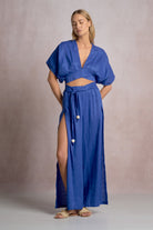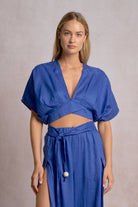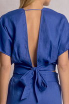 The Brantley Crop Top Tie Back in Sapphire Blue from Elan brings an elevated, resort-ready feel to warm-weather dressing. Designed with a deep V neckline and softly draped short sleeves, this cropped silhouette flatters while keeping things effortlessly relaxed. The wrap-style front creates subtle structure, while the adjustable tie-back allows for a customized, comfortable fit. Lightweight and breezy, it pairs perfectly with matching skirts, linen pants, or high-rise denim for a polished look that moves easily from day to night.