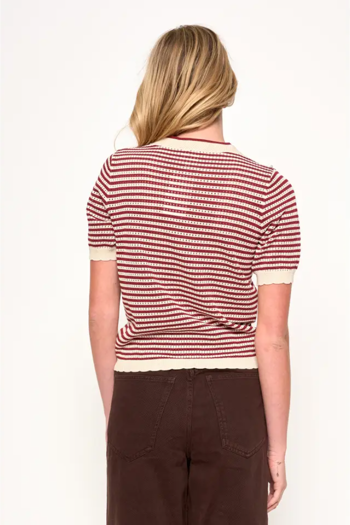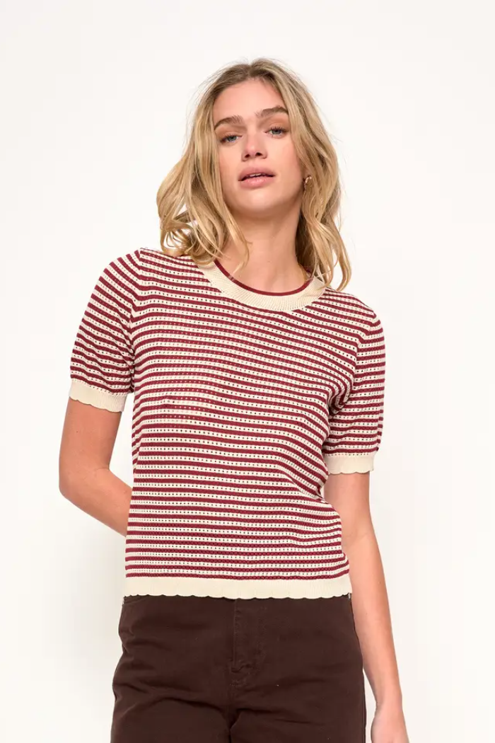 CORA TOP This vintage-inspired open-knit Cora sweater top, in an Auberge Ivory stripe, features delicate scalloped edge sleeves and a contrasting cream athletic band neckline for a sporty yet elegant touch. Lightweight and breathable, it’s perfect for layering or wearing alone to add a subtle retro flair to any outfit