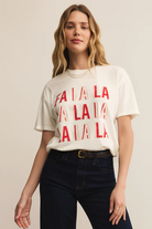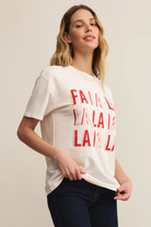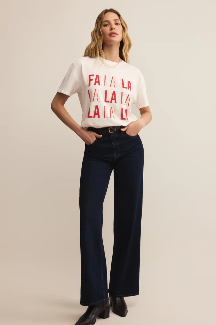 Made from soft cotton jersey with a vintage-inspired wash, this boyfriend tee brings comfort and playfulness in equal measure. The bold “Fa La La” graphic with gold foil detail makes it an instant favorite for layering this season.