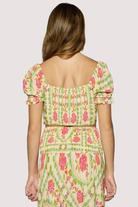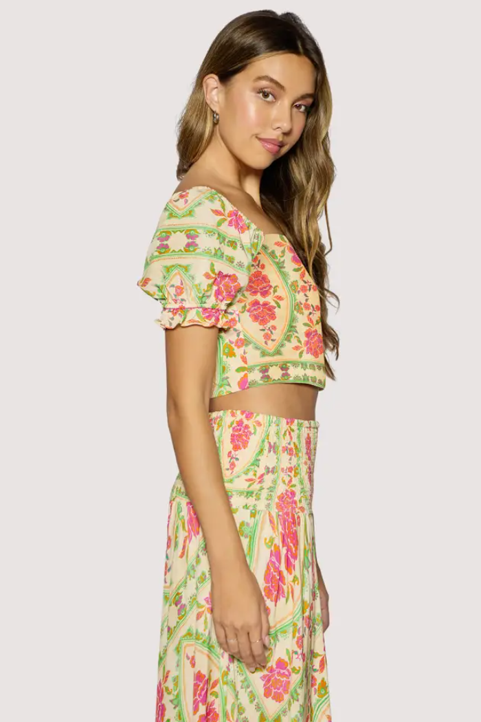 A cropped, floral-print top with a square-style neckline and short puff sleeves that reads breezy and sun-ready. The Fiesta Flora Top from Lost & Wander is cut from a lightweight woven fabric and features a fitted bodice that pairs perfectly with the matching flowing skirt. Wear it for weekend markets or vacation days when you want a romantic, boho-inspired look.