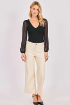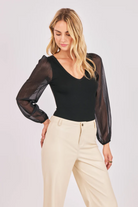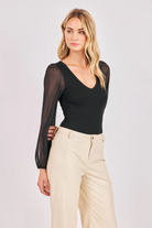 Effortlessly chic with a touch of holiday sparkle, the Gleam Mixed Media Bodysuit combines a sleek, fitted silhouette with airy, puffed sleeves for a flirty, feminine look. The subtle shimmer adds just the right amount of festive flair, making it the perfect piece to turn heads at any occasion.