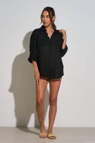 Embrace effortless vacation style with the Graphic Button Down in Black. Crafted from soft, breathable cotton, this relaxed-fit shirt features a classic spread collar and button-front closure for timeless appeal. Long sleeves with buttoned cuffs add versatility, while a bold graphic print on the back brings a playful, wanderlust-inspired touch, perfect for keeping your travel vibes alive wherever you go. Pair it with shorts, denim, or a flowy skirt for an easy, stylish look.