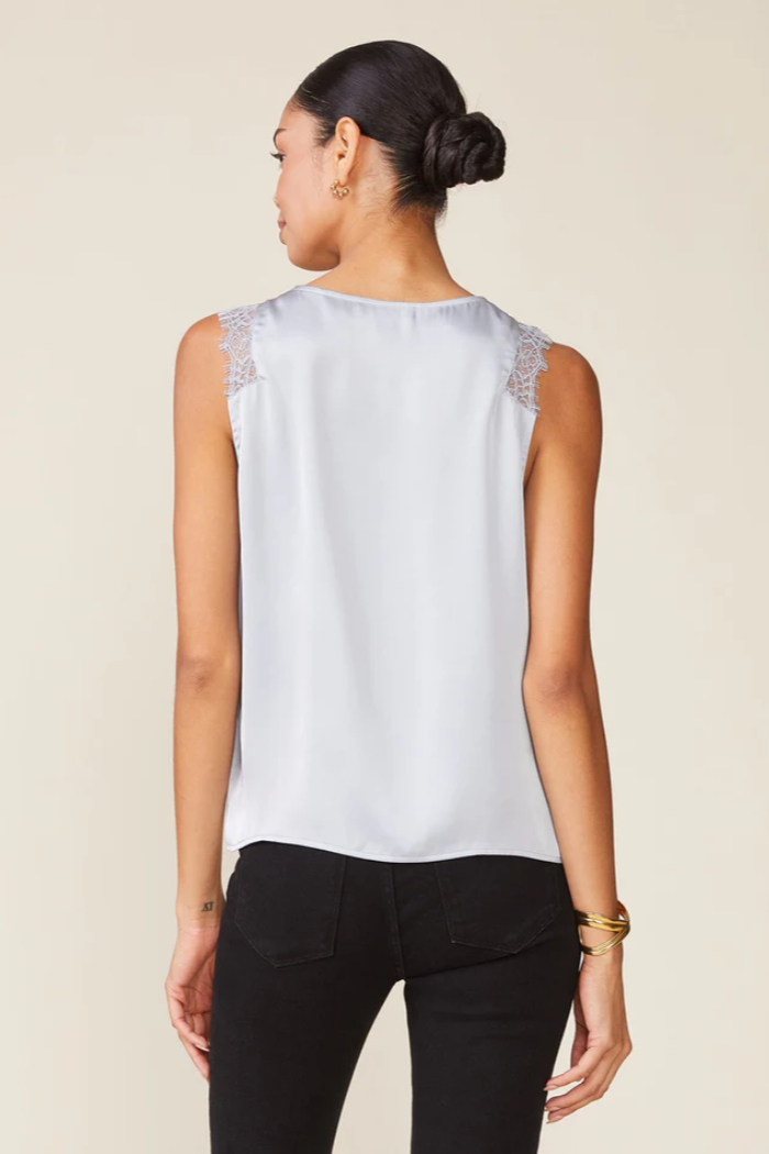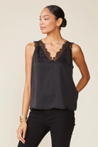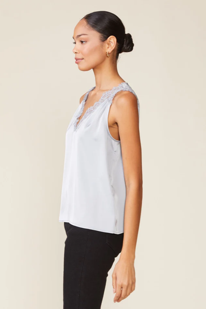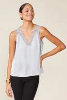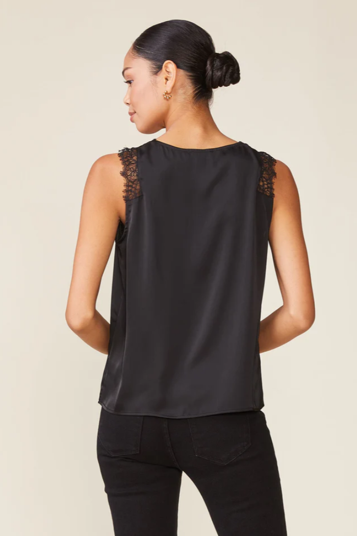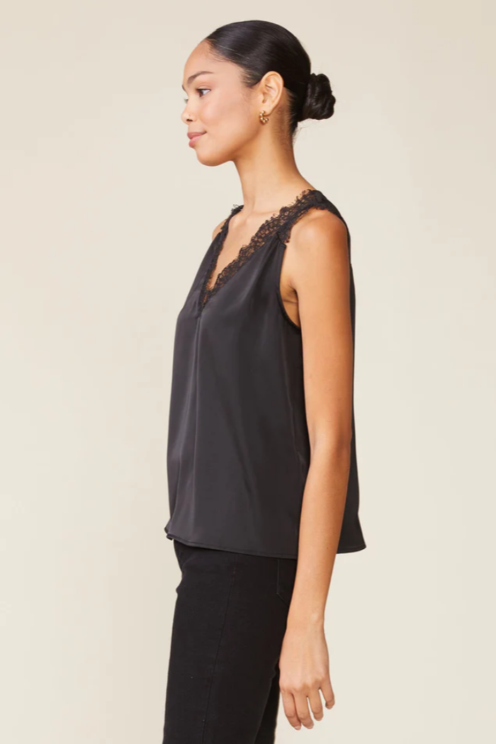 This sleeveless satin cami features intricate eyelash lace detailing along the v-neck and shoulders. All eyes will be on your as you take center stage in this wear everywhere feminine cami.