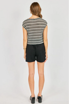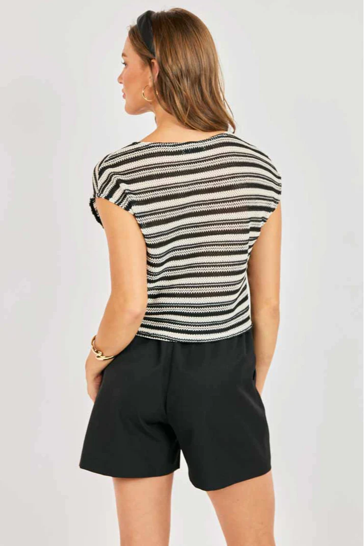 The Moonlit Path Top is a cropped striped knit top with a relaxed boxy silhouette and subtle cap sleeves. Sadie and Sage designed this breezy piece with a scoop neckline and open-weave texture for an easy, lived-in look. Pair it with high-waist shorts or denim for casual weekend styling.