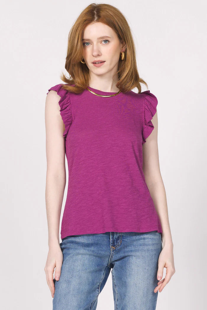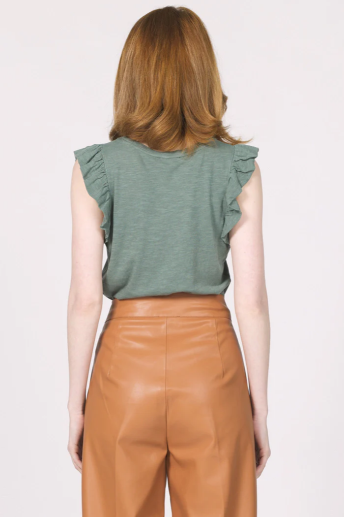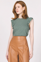 The free-spirited North is a flawless combination of style and ease. Our crew neck slub tank with ruffle-trimmed sleeves elevates any outfit, classic fitting is perfect for those who crave versatility and elegance in their wardrobe. Don't settle for ordinary - embrace the adventure with this essential piece!