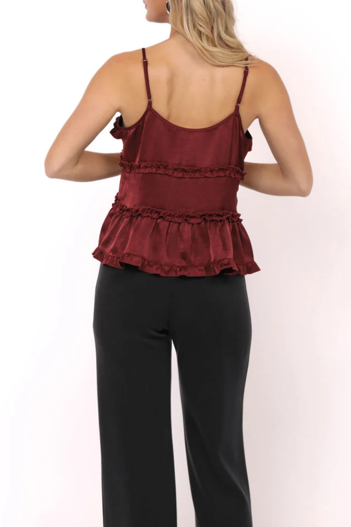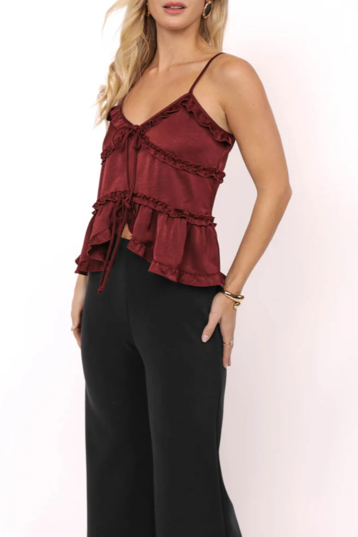 This piece brings effortless elegance to any moment. Designed in a deep burgundy satin, it catches the light with a soft, luxurious sheen. Delicate ruffle trims and petite bow accents trace the neckline, adding a sweet, romantic charm. Adjustable spaghetti straps let you tailor the fit to your liking, while the fluid drape of the fabric flatters your natural shape. Perfect for date nights, special occasions, or simply when you want to feel beautiful.