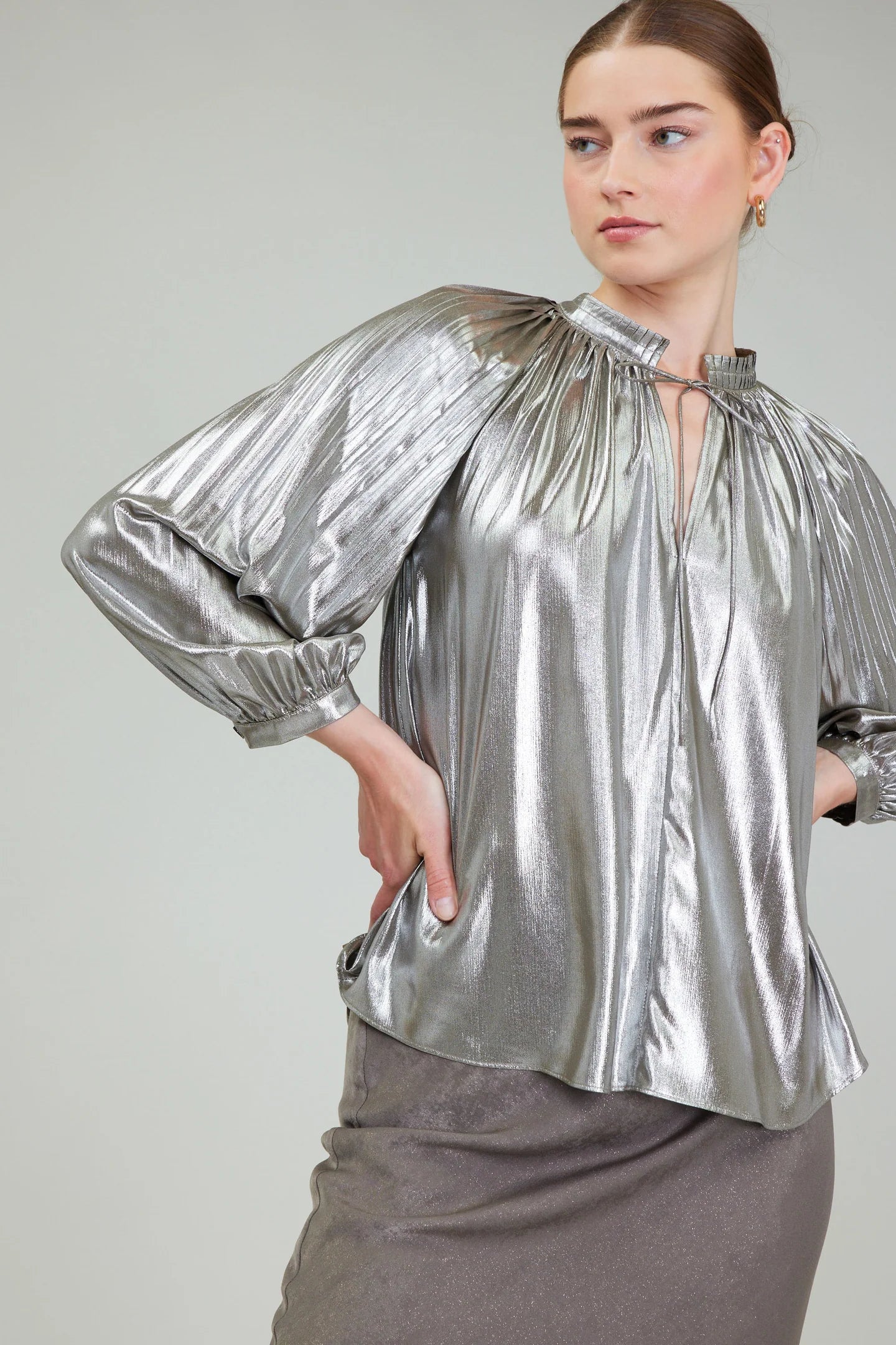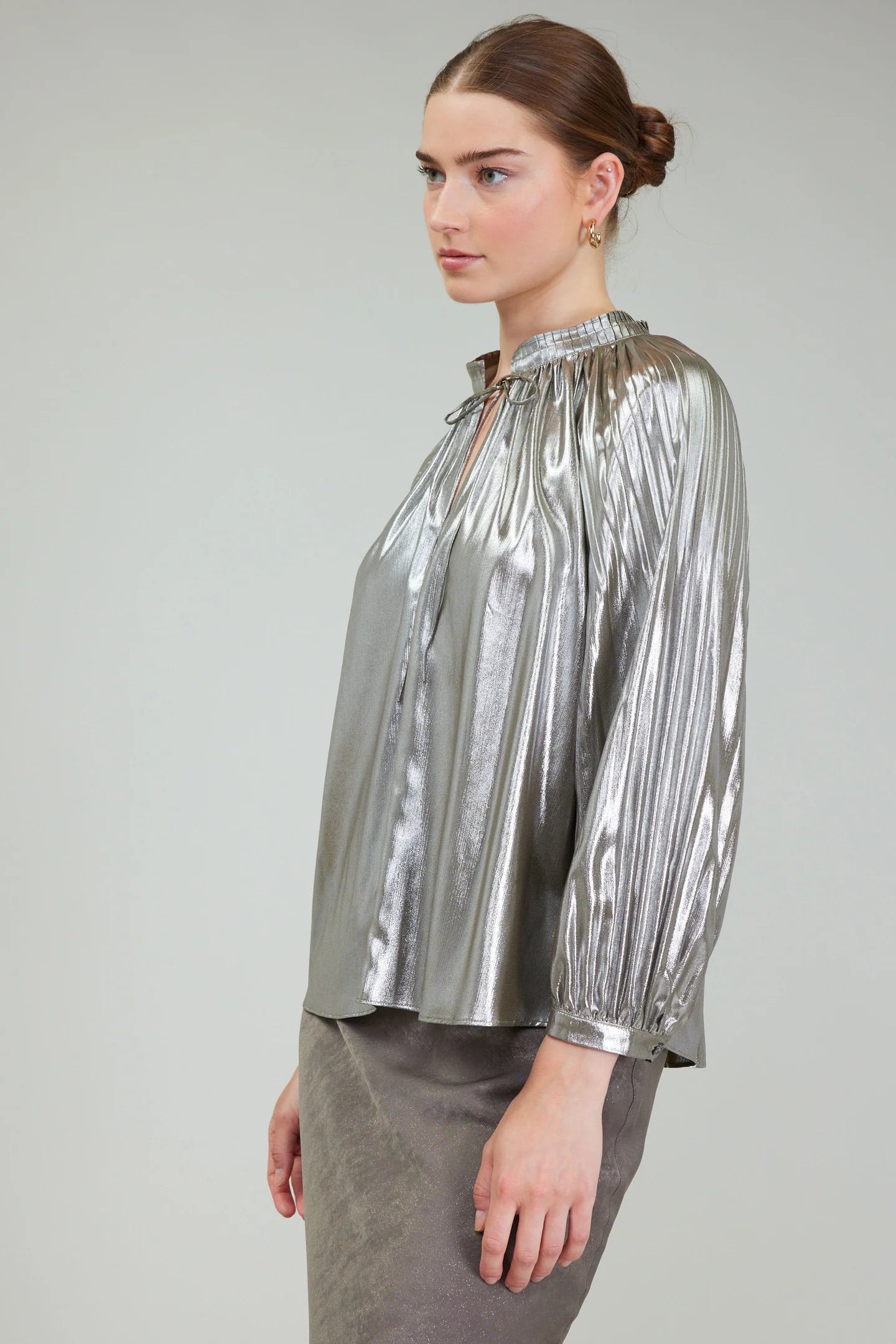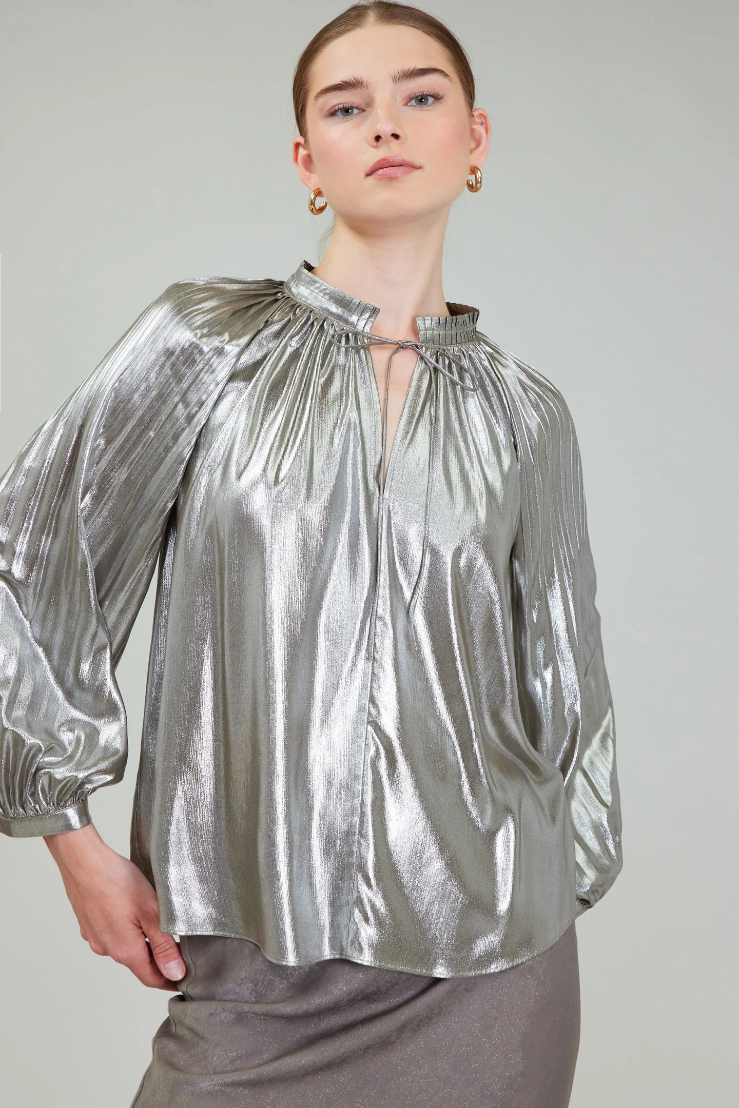 Radiate elegance in this metallic silver blouse, with delicate olive undertones that catch the light. Perfect for nights out, its relaxed fit and gleaming finish enhance the pleated neckline and gathered detailing for a refined yet effortless look.