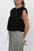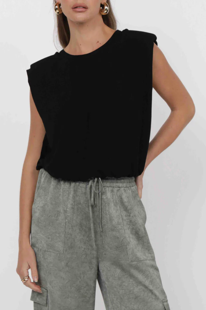 Meet your new power piece. The **So Into You Shoulder Pad Top** by Sage The Label delivers effortless confidence with a sleek, sculpted silhouette. Designed in a soft, stretchy knit, this sleeveless top features bold shoulder pads that add structure and definition, while the elastic hem creates a flattering, tucked-in effect without the fuss.