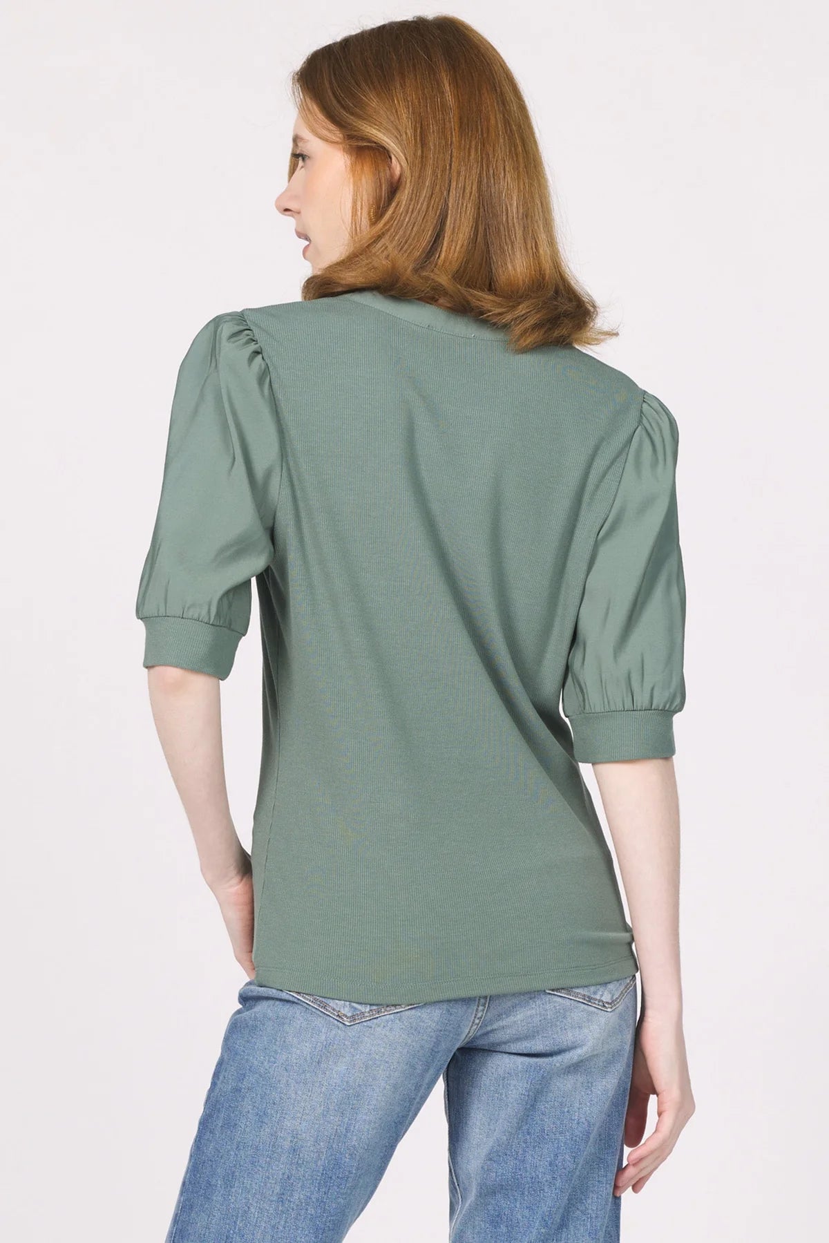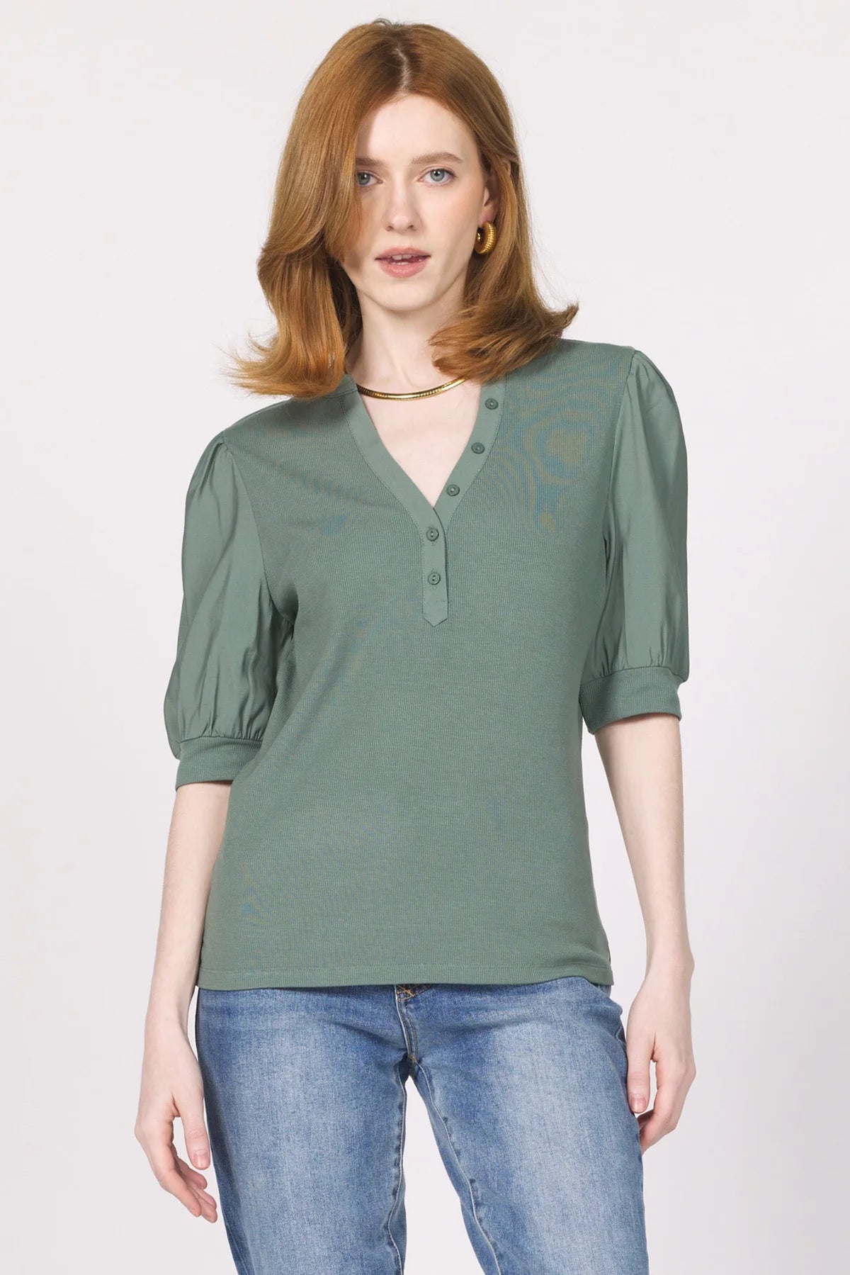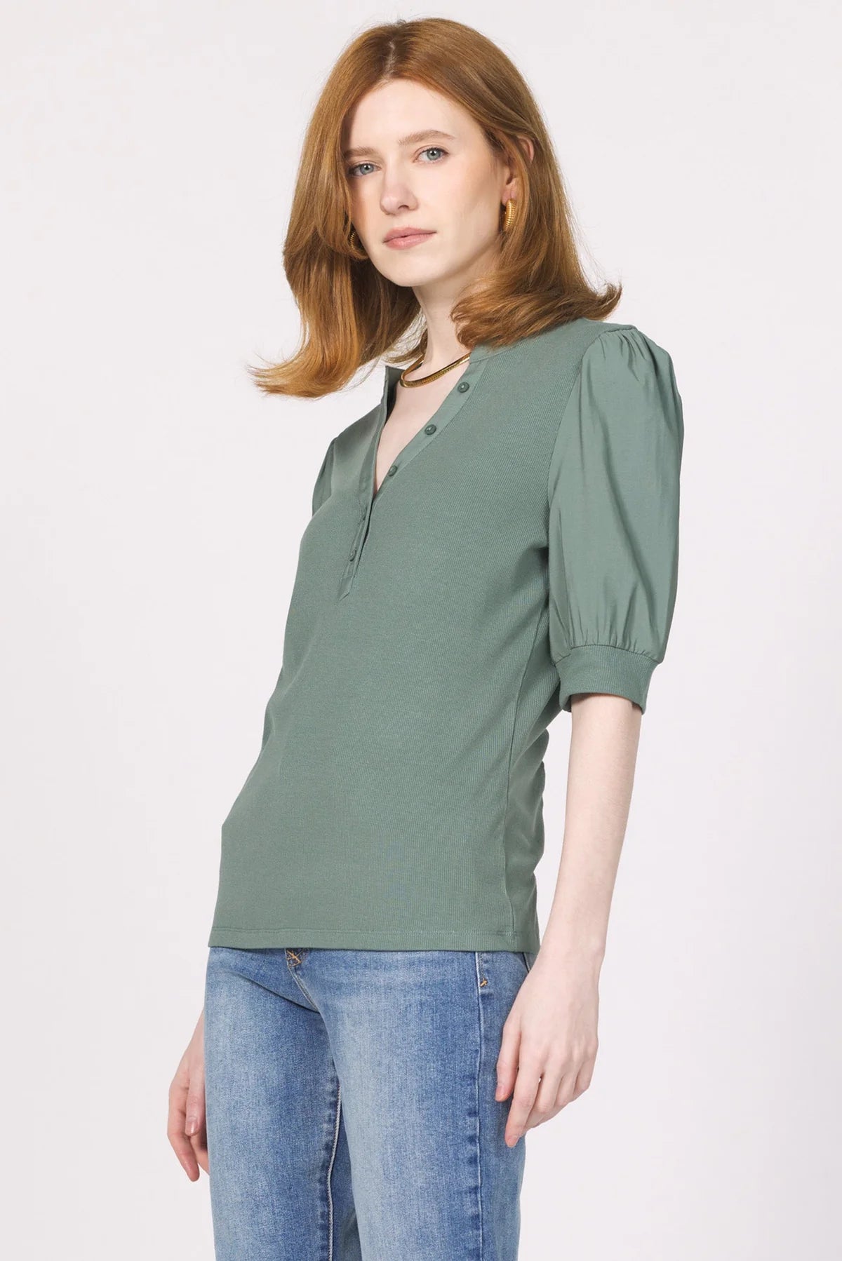The Tanner rib henley features elegant puffed sleeves with cuffs and a comfortable buttoned front. The solid color knit and standard fit provide both color richness and uncompromising softness.