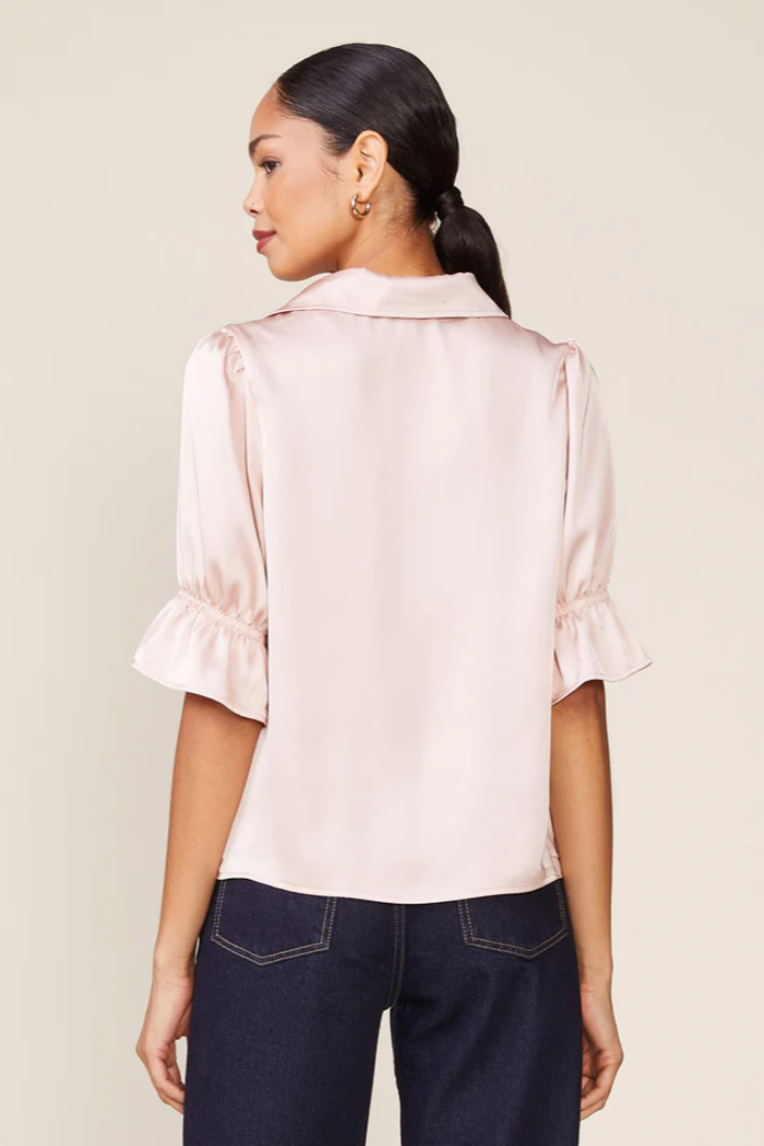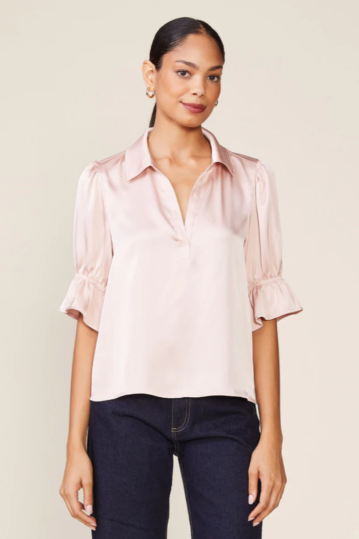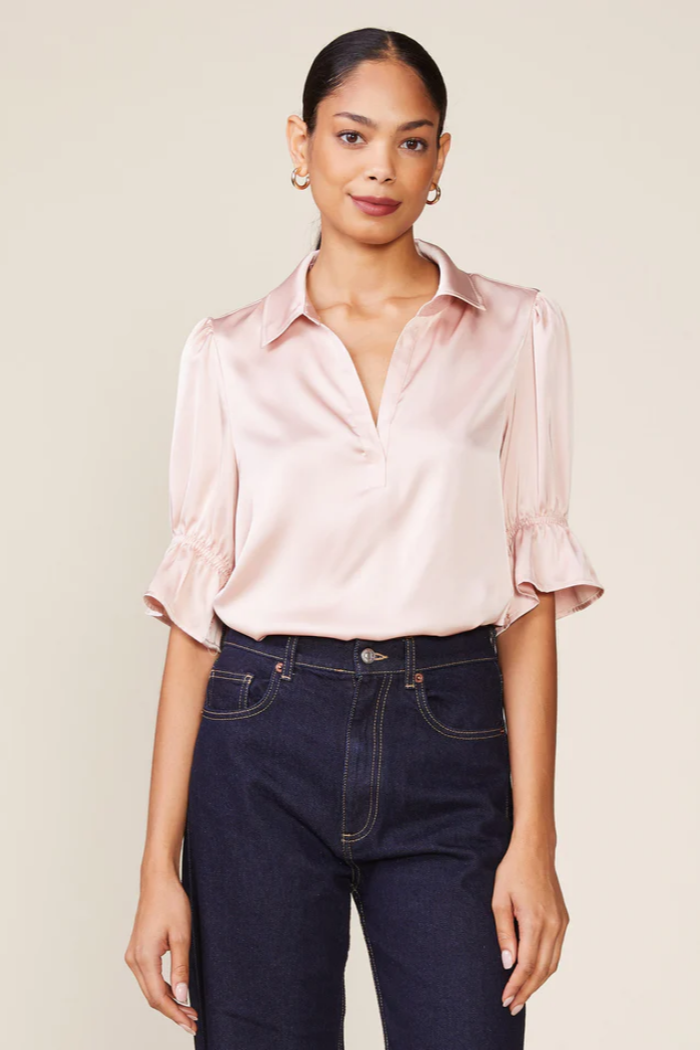 This top is made in our silky soft sunset satin and features a split neck with collar and cinched short sleeves. The light and flowy fabric drapes effortlessly for a polished fit, perfect as a day-to-night piece to wear on repeat. Pair this top with our Lace Midi Skirt for a festive party fit.