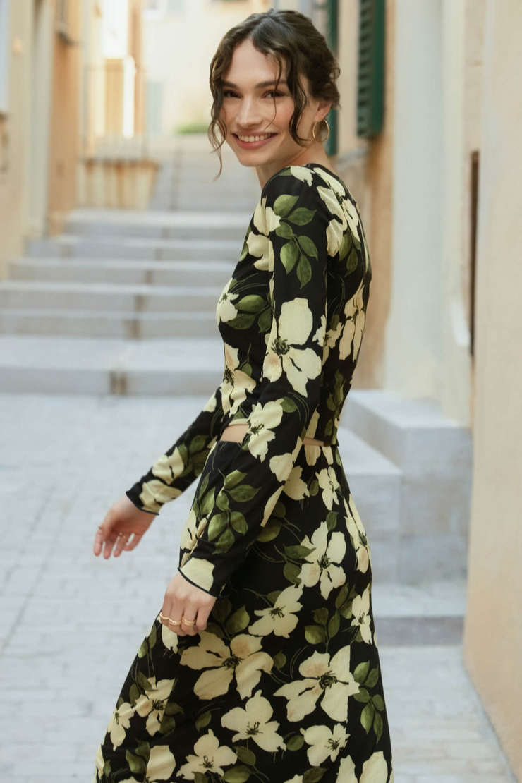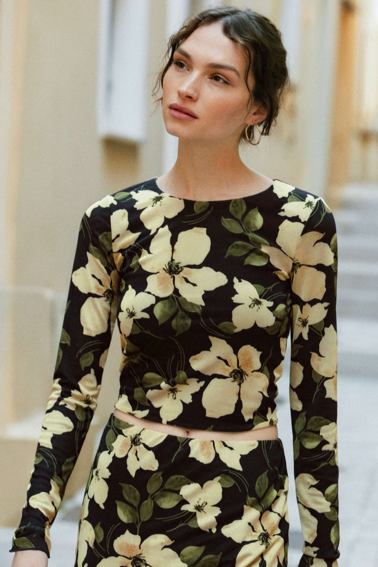 Romantic yet modern, this fitted mesh top features a tonal floral print that adds soft dimension and texture. With sheer sleeves and a lined body, it’s a versatile statement piece that pairs beautifully with denim or layers seamlessly under a blazer.