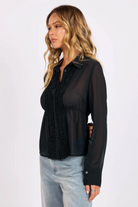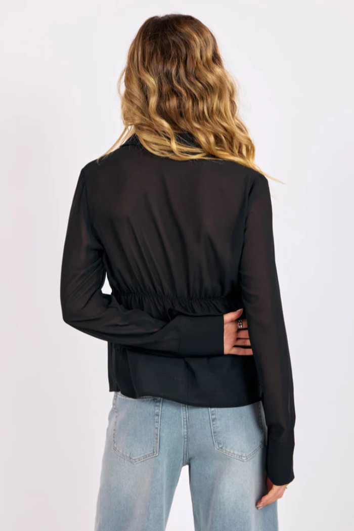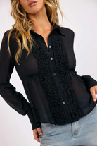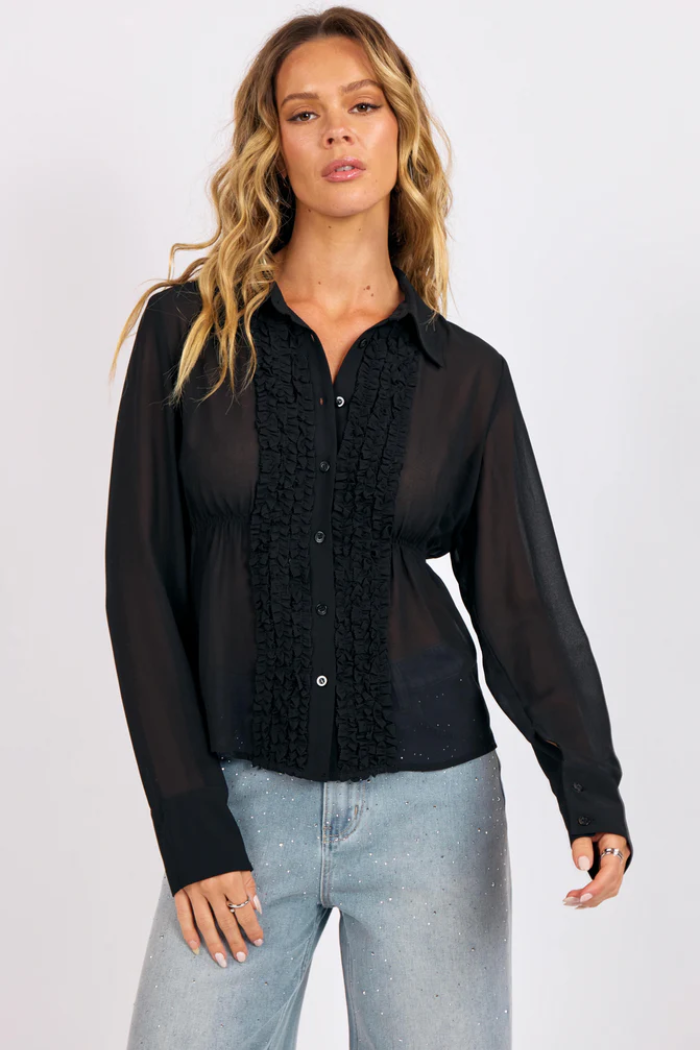The Terra Sheer Ruffle Tuxedo Blouse from Sage The Label brings a modern, romantic edge to classic tailoring. Crafted in an airy sheer black fabric, it drapes beautifully while adding just the right amount of drama. Soft ruffled trim frames the button-front placket for a feminine twist, while the subtle cinched waist creates a flattering, gently defined silhouette.