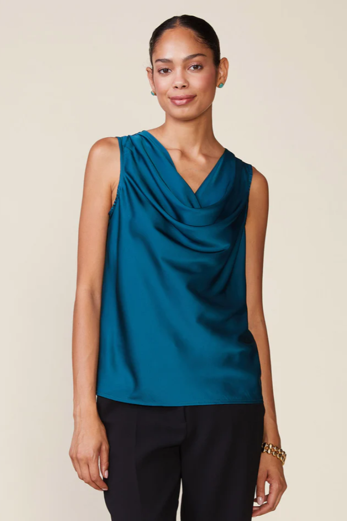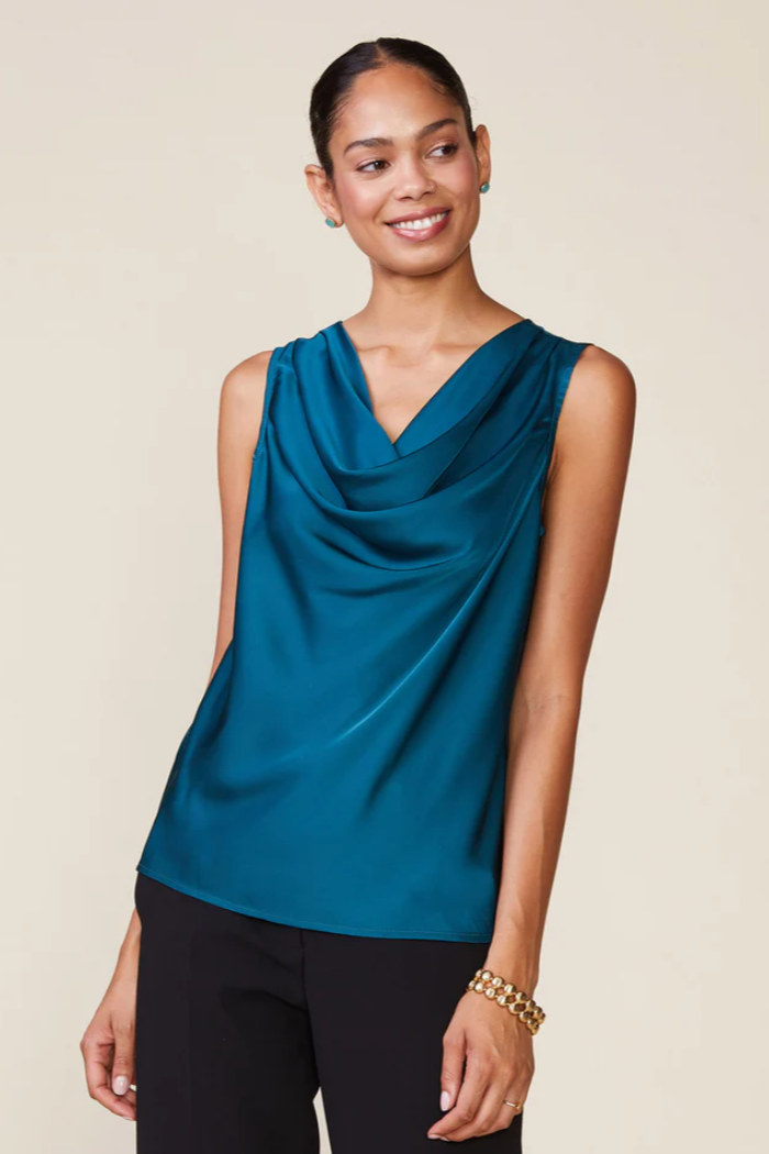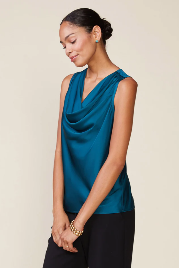 A classic cowl neck shell perfect to wear alone or layered. A beautiful satin piece to wear on repeat.