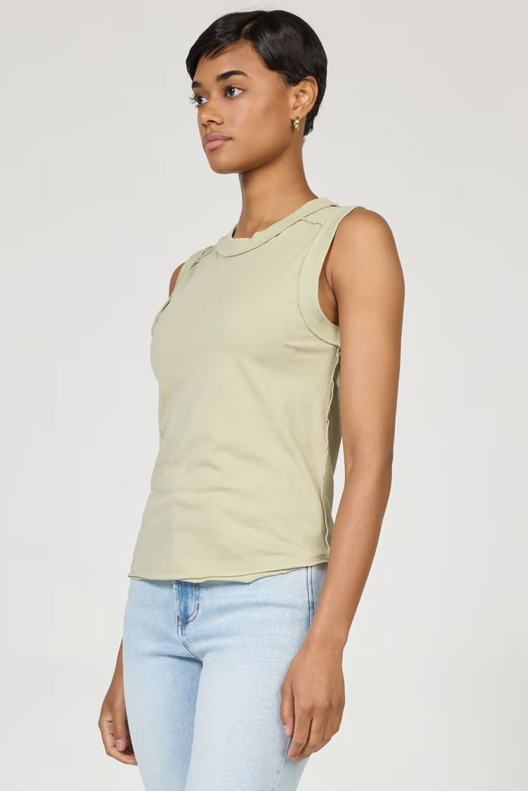 This sleeveless Abbey Stone top features a classic crew neck design with raw edge details, perfect for adding a touch of casual flair to your wardrobe.