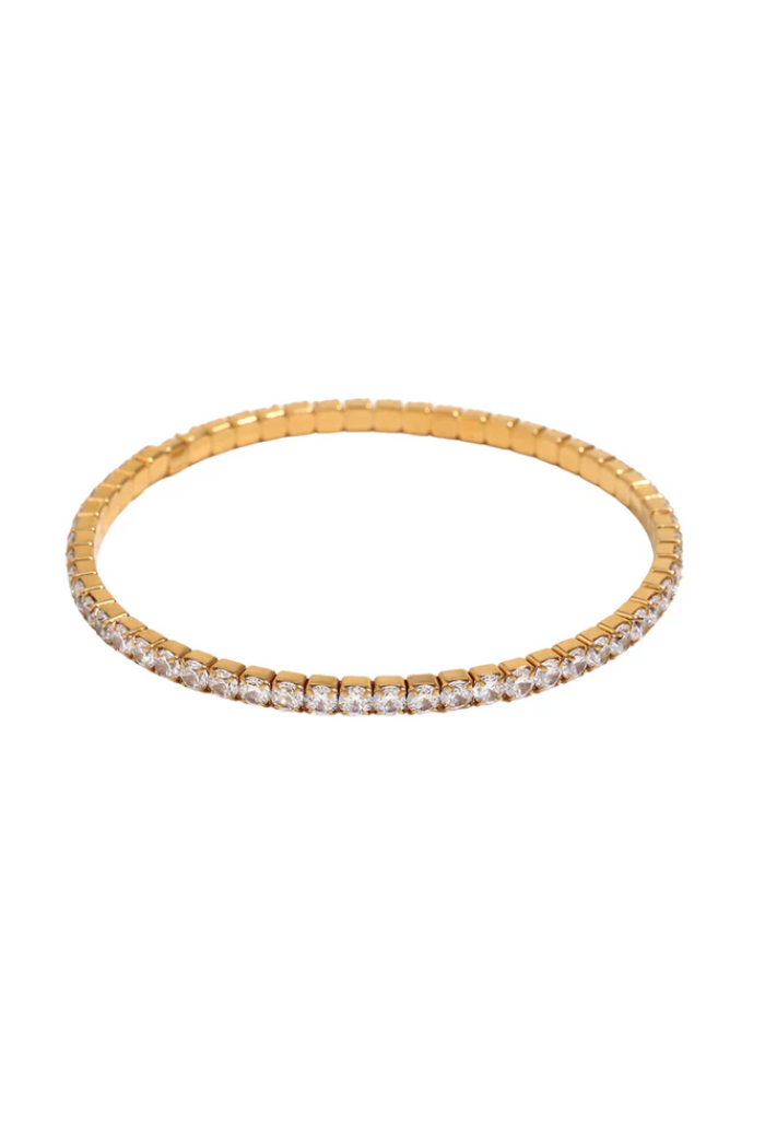 Elevate your everyday elegance with the 3mm Gold Stretchy Tennis Bracelet from Hjane Jewels. This timeless piece features dazzling cubic zirconia stones set in classic shared prongs, catching the light beautifully with every movement. Crafted from 18k gold-plated stainless steel, it is tarnish-resistant and gentle on sensitive skin, ensuring long-lasting wear without compromise.