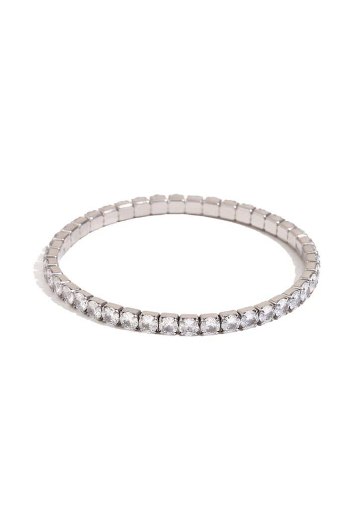 The Hjane 4mm silver tennis bracelet offers sparkle and style with zero hassle. The stretch fit replaces traditional clasps, while the larger CZ stones provide just the right amount of shine, making it a versatile and cherished addition to any jewelry collection.