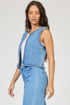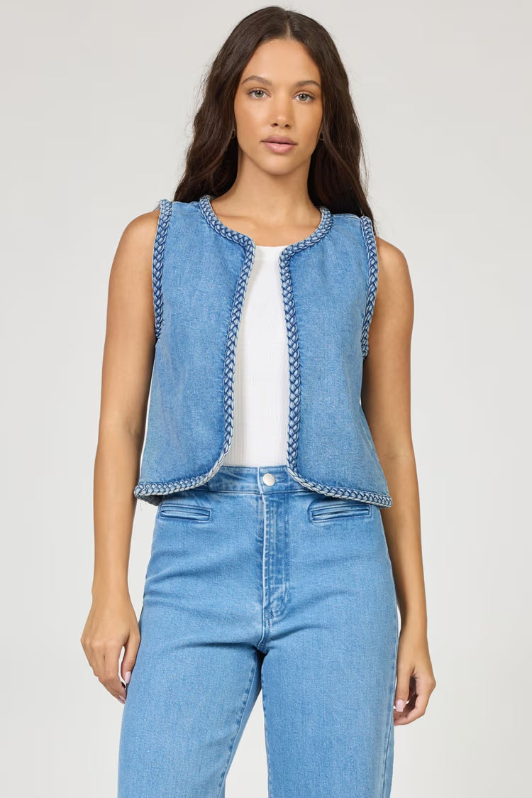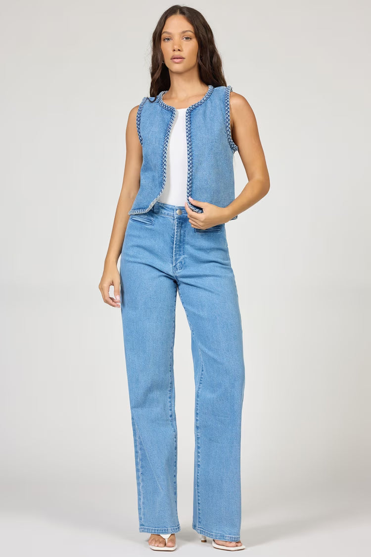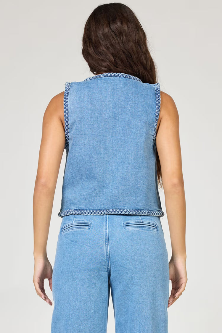 Experience the perfect blend of style and comfort with the braided denim vest, tailored for a classic look.