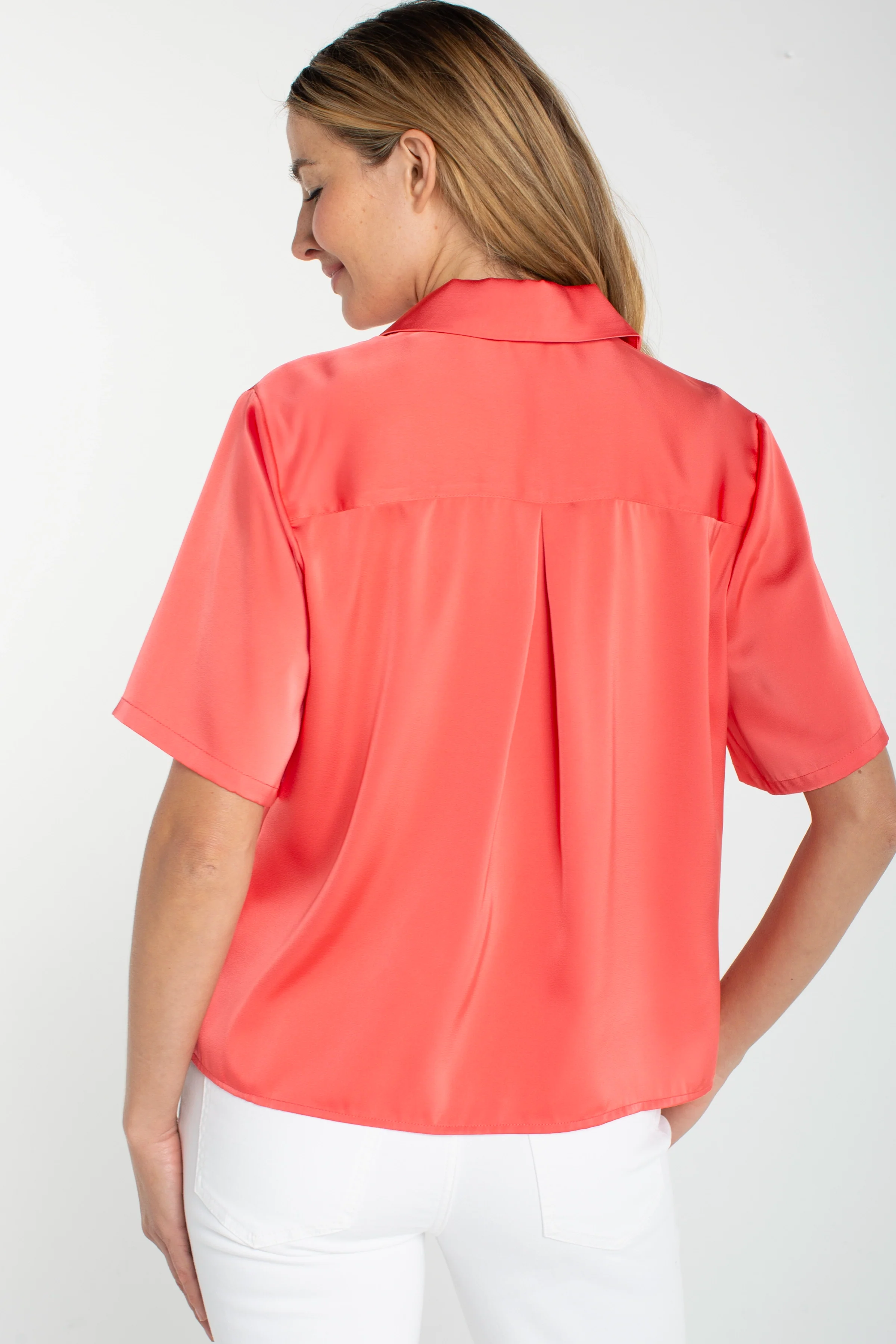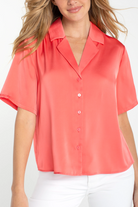 A fresh update to a timeless favorite, the Addison Woven Top redefines the classic camp collar with a modern, streamlined feel. Crafted from a lightweight woven fabric, this blouse features short sleeves and a clean inverted placket for a smooth, effortless silhouette. The warm Sunset Coral hue adds a vibrant yet sophisticated pop of color, making it an easy standout for everyday wear.