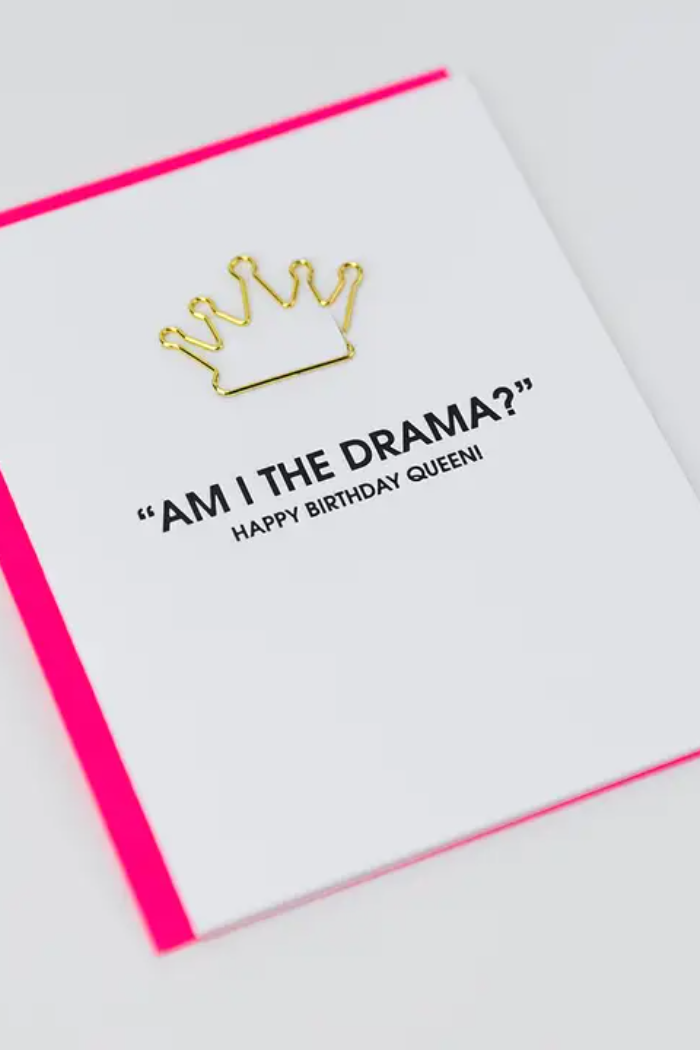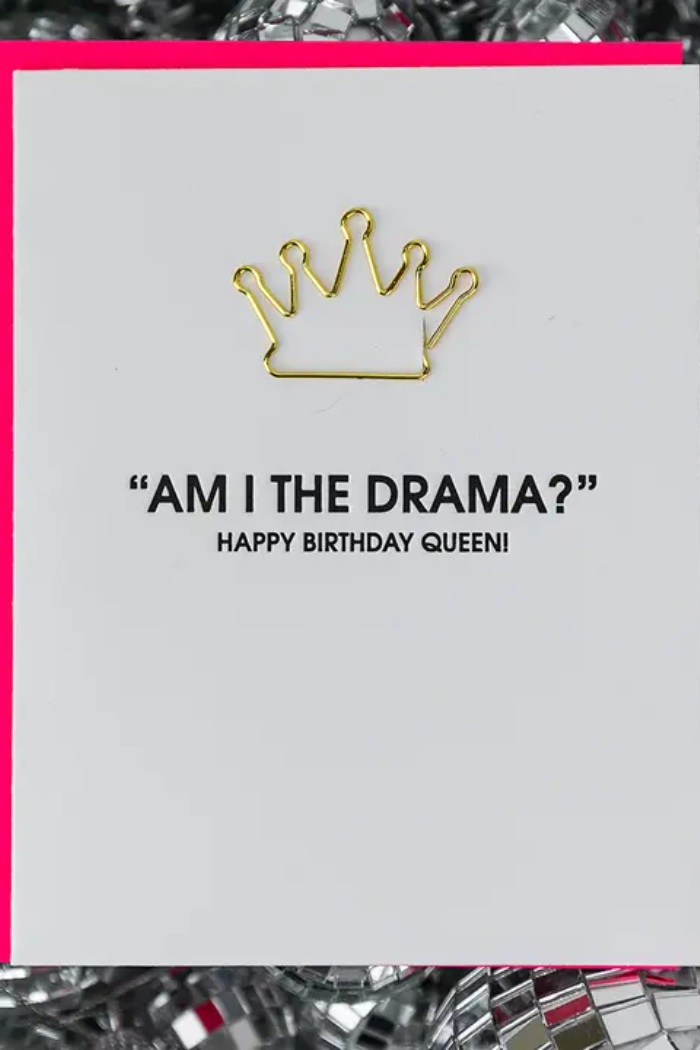 Send a card that steals the spotlight with our “Am I the Drama?” design, letterpress printed by hand on luxe, tree-free paper. Bold and cheeky, it’s the perfect way to celebrate birthdays or any moment when your favorite drama queen deserves the crown. Each card includes a reusable gold crown-shaped paper clip—a keepsake your recipient can cherish long after the card is tucked away.