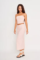 The chic straight midi-length Amala skirt hugs your silhouette for a flattering fitted look. Crafted from a Pink Ivory stripe knit, this skirt offers a stylish twist on classic stripes, making it a versatile addition to any outfit. Perfect for pairing with your favorite tops or layering with jackets, this skirt transitions effortlessly from day to night.