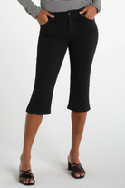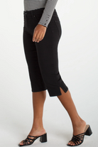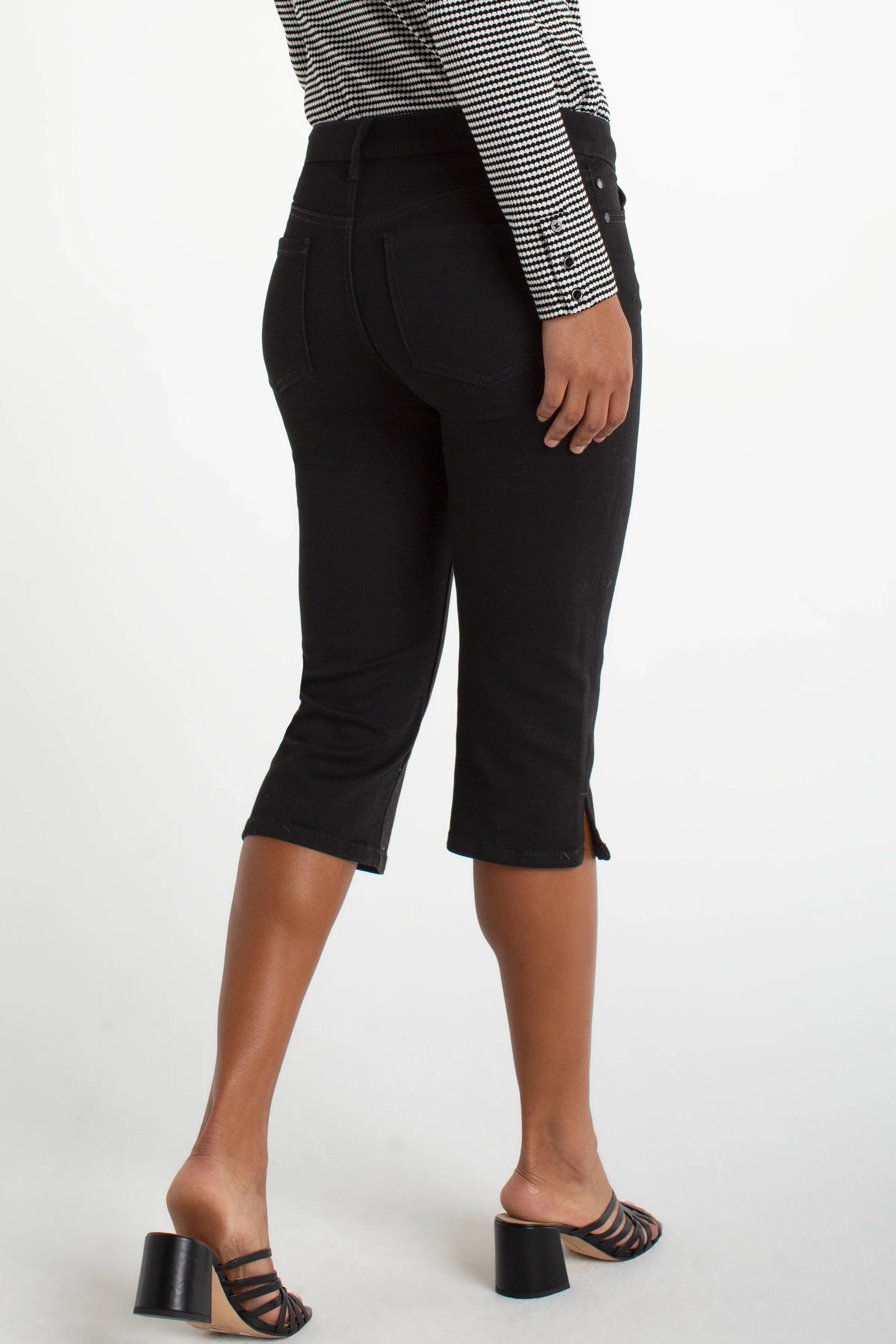 Sleek, flattering, and endlessly versatile, the Aria Capri Pants in Black from Liverpool Los Angeles are your go-to for polished warm-weather style. Designed with a mid-rise fit and a clean, streamlined silhouette, this capri hits at just the right length for a modern, refined look. A subtle side slit adds movement and a hint of detail, while classic five-pocket styling keeps it timeless and wearable.