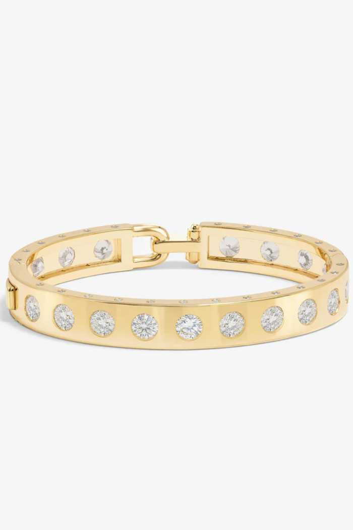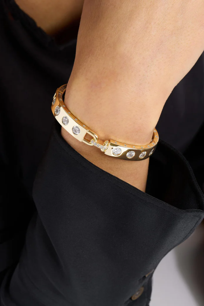 Elevate your wrist game with the Ashley Rodeo Lock Cuff, a stunning 9mm statement piece that demands attention. This chunky, thick silhouette features intricate lock-inspired detailing and brilliant bezel-set round simulated diamonds that sparkle from every angle. Designed for those who love a bold, luxury aesthetic, this trendy cuff is the perfect addition to your everyday rotation or a contemporary formal look. Its seamless hinge and high-quality gold plating provide a comfortable fit that truly clicks into place. Whether you wear it solo for a minimalist statement or layer it with other favorites from our latest handcrafted bracelet selection, this elegant cuff is an absolute must-have. Discover the perfect blend of edgy and classy craftsmanship that makes this cuff a standout in any modern jewelry rotation.