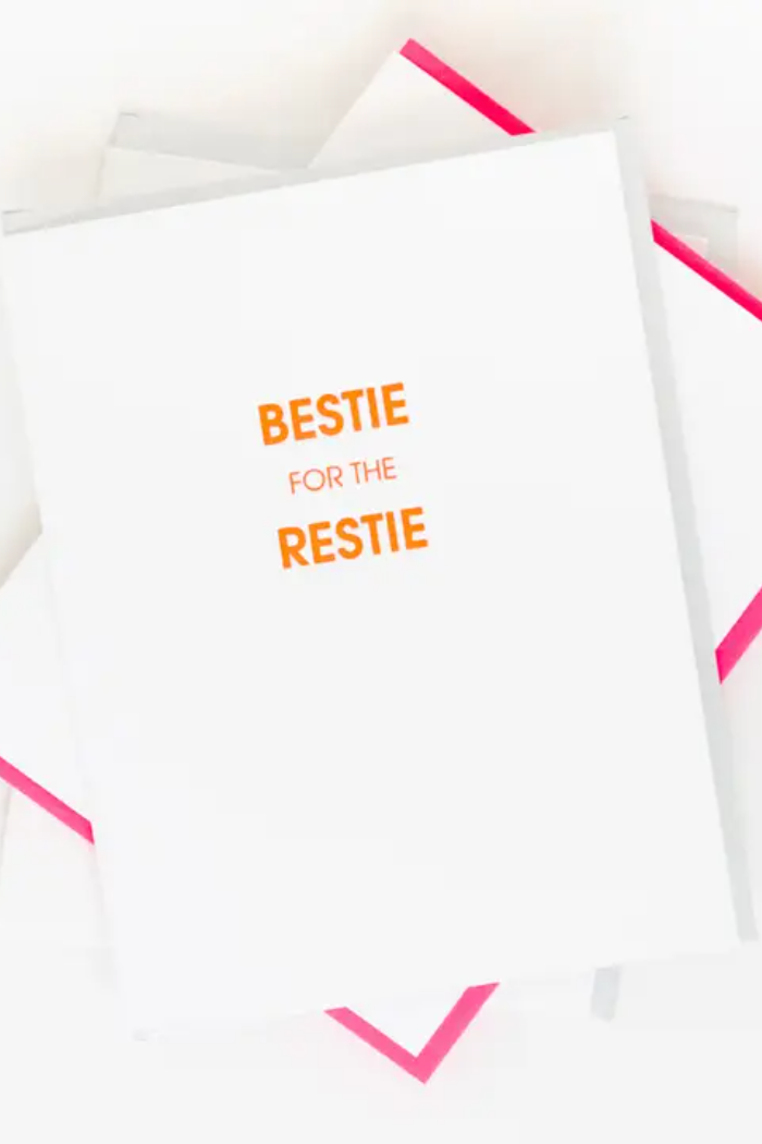 Celebrate the friend who’s stuck with you for life with our Bestie for the Restie card. Letterpress printed by hand on luxe, tree-free paper in a bold neon orange, it’s a fun and heartfelt way to remind your bestie how much they mean to you. Perfect for birthdays, just-because notes, or any moment you want to show some love.