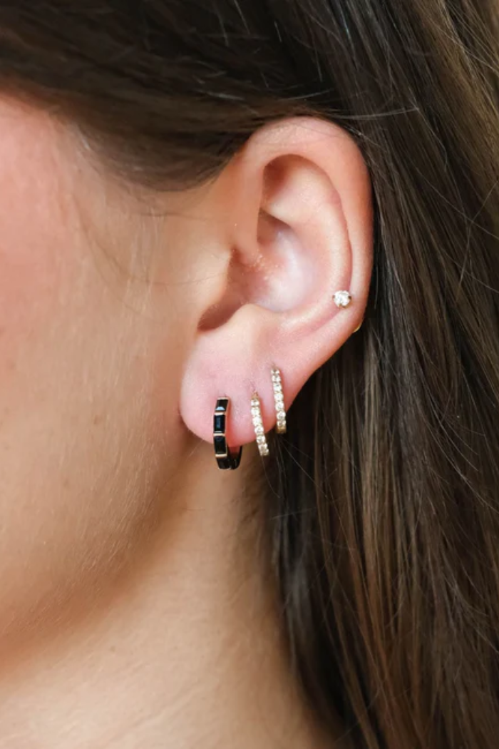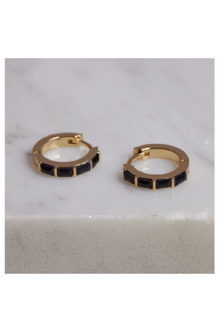 Our Black Crystal Baguette Huggies feature four sparkling glass stones set in 14k gold plating or silver plating. These studs are the perfect earring for effortless wear and comfort!