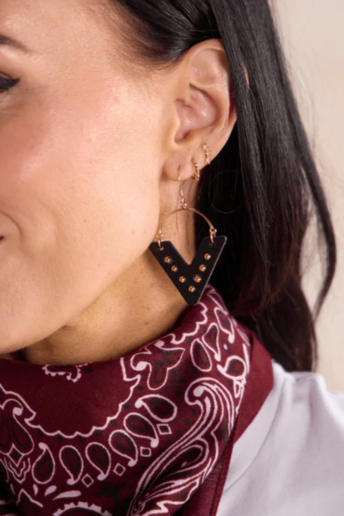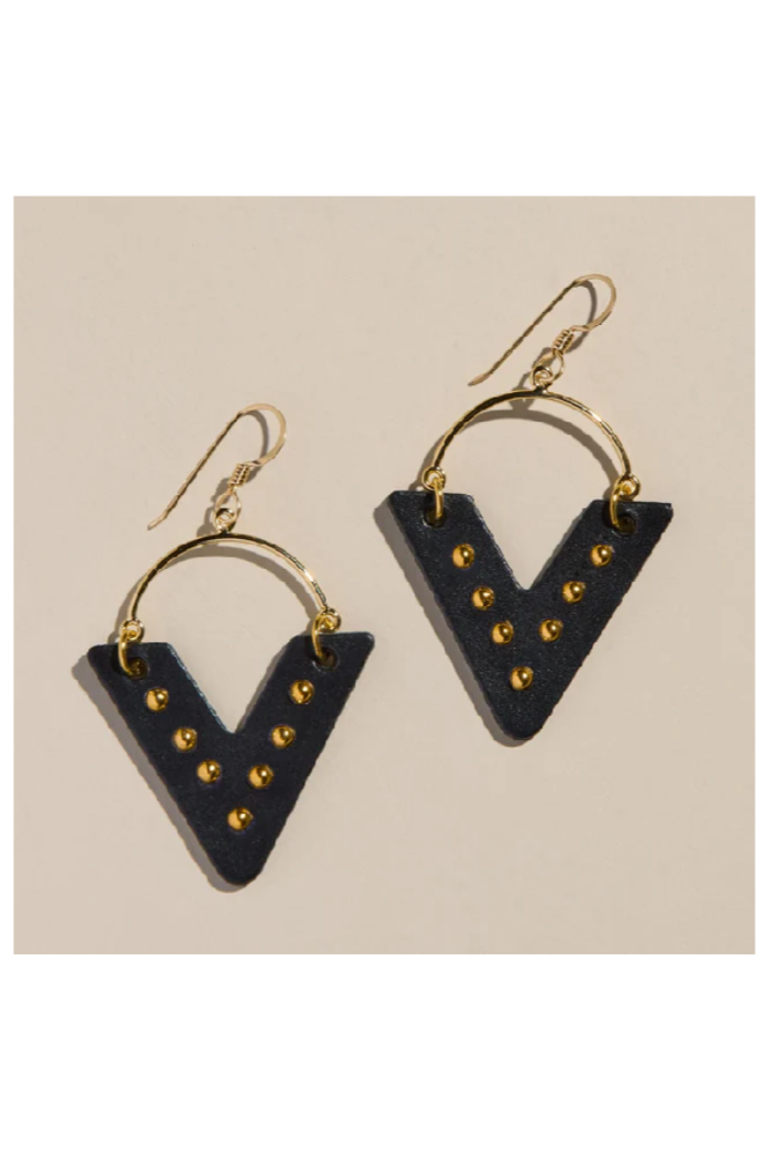 Make a statement with the Black Studded Sutton earrings. They feature a geometric shape and are crafted with gold studs applied individually by hand.