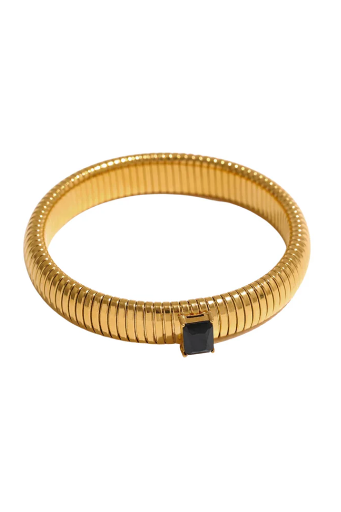 Sleek and effortlessly modern, the Black Tube Bracelet from Hjane Jewels adds a refined edge to any look. Crafted with a gold-toned stainless steel flex snake chain, this bangle-style bracelet wraps comfortably around the wrist with a smooth, polished finish. The bold black square accent stone creates a striking contrast, offering a minimalist statement that feels both timeless and contemporary. Perfect for stacking or wearing solo, this piece transitions seamlessly from everyday wear to elevated evening styling.