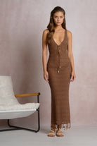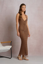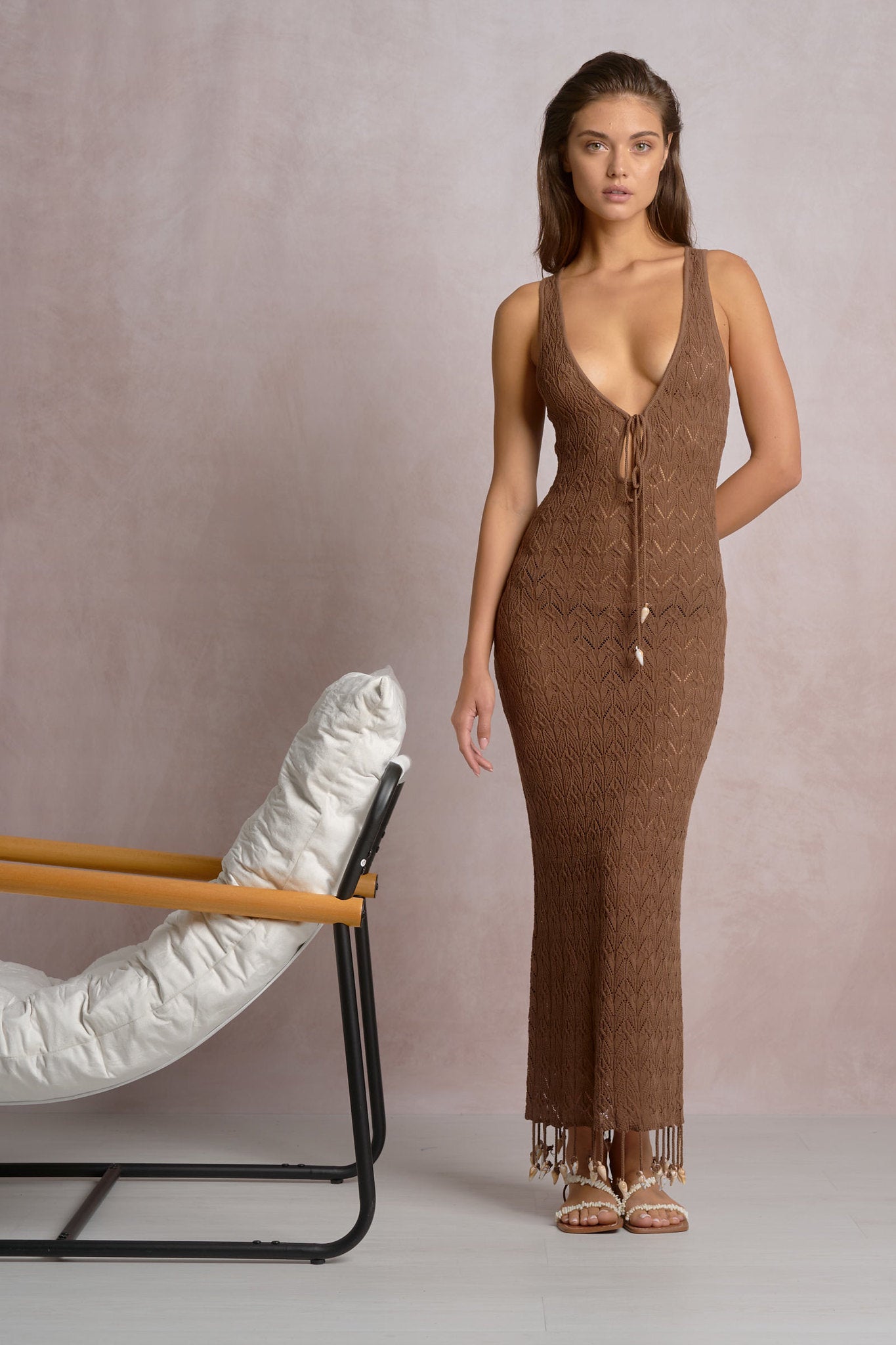 Effortless, versatile, and undeniably chic, the Blythe Maxi Dress is your go-to for sun-soaked days and breezy evenings. Crafted in a rich brown open-knit design, this semi-sheer maxi offers a flattering, body-skimming silhouette that transitions seamlessly from beach cover-up to cocktail-ready style. The plunging V-neckline with delicate tassel ties adds a feminine, adjustable touch, while shell embellishments along the hem bring a playful, coastal-inspired detail to your look.