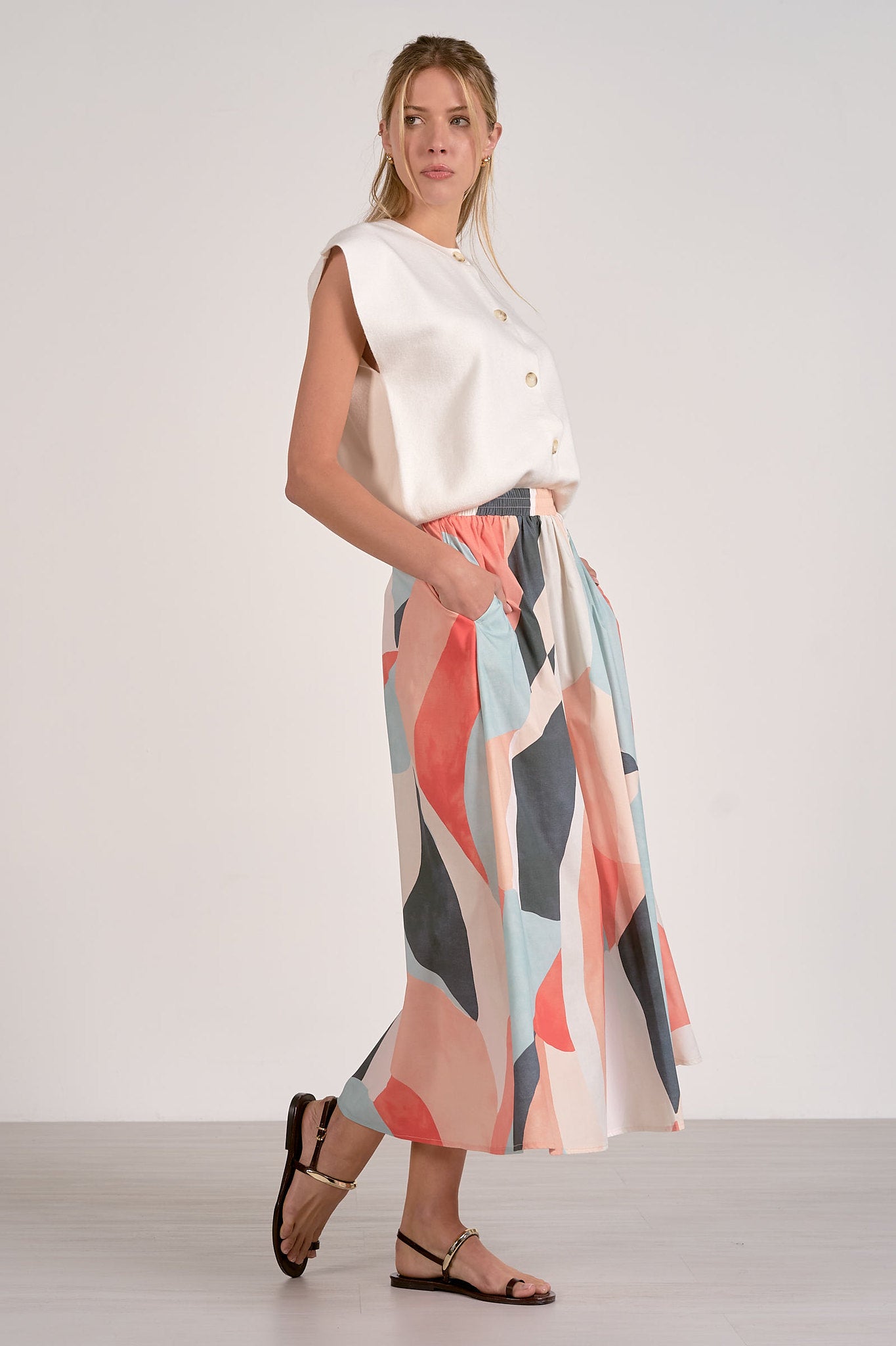 Bold, vibrant, and effortlessly wearable, the Brianna Midi Skirt in Multiprism features a striking geometric print that instantly elevates your look. The comfortable elastic waistband offers an easy, flattering fit, while hidden side pockets add everyday practicality. Lightweight and versatile, it’s a standout piece you’ll reach for again and again.