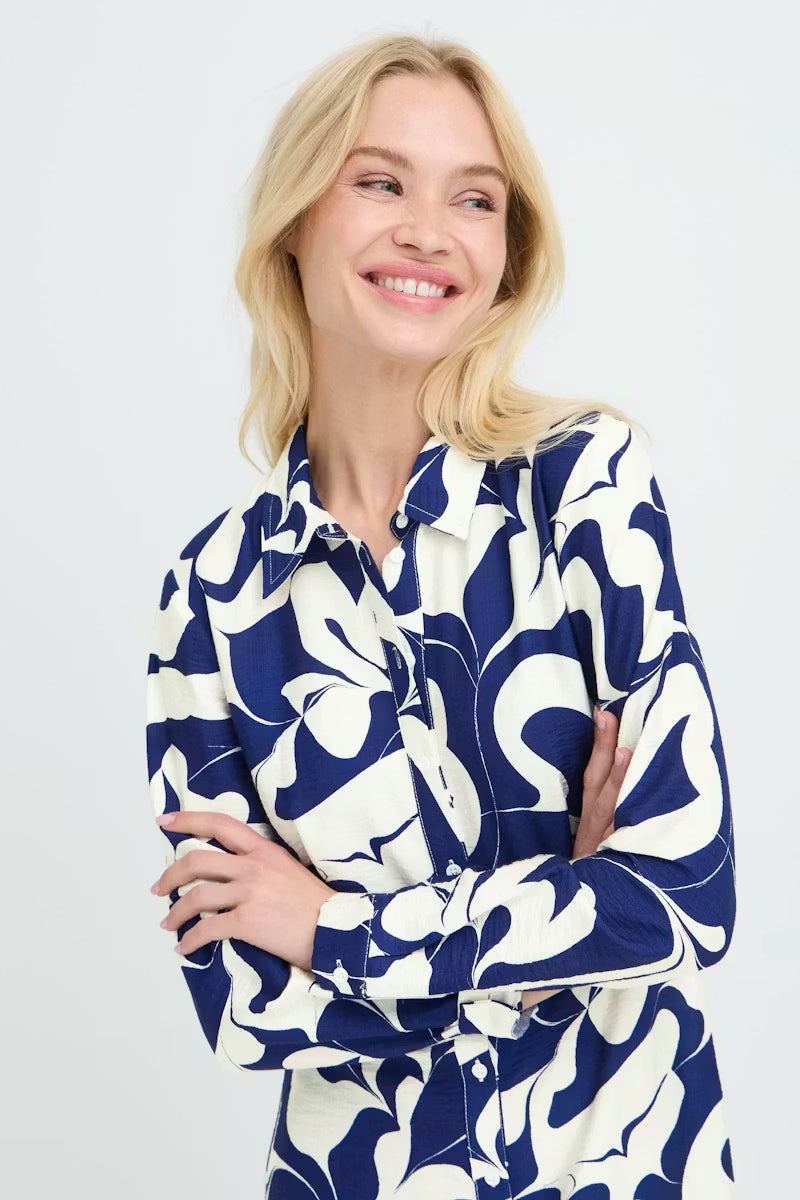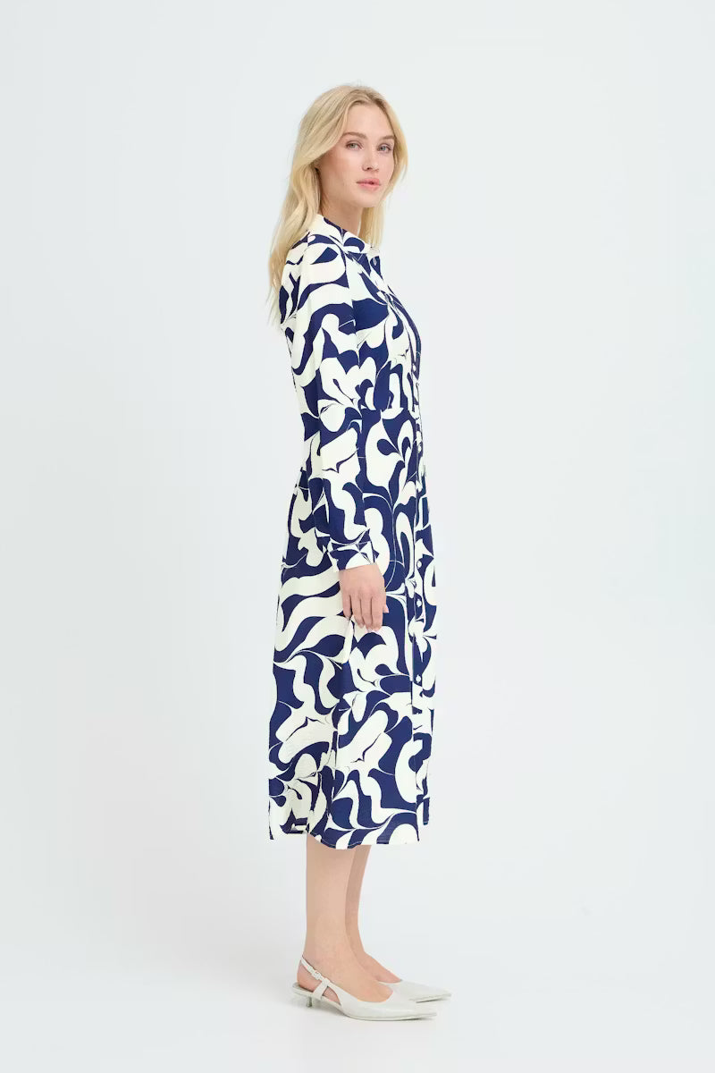 Effortlessly chic and timelessly versatile, the Byikaia Shirt Dress in Navy and White brings a modern twist to a classic silhouette. Featuring a flattering straight fit and midi length, this dress is adorned with an all-over abstract pattern that adds visual interest while remaining sophisticated. The pointed collar, long sleeves with buttoned cuffs, and full front button closure create a polished, tailored look that works for any occasion.