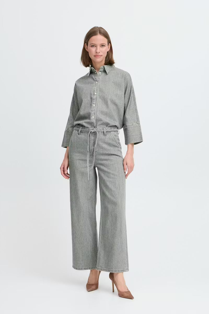 Wide leg jeans feature a high waist, relaxed and full-length silhouette, and a soft-textured appearance. Designed with a self-tie belt and functional side pockets, these jeans offer a structured yet easy fit through the hip and thigh.